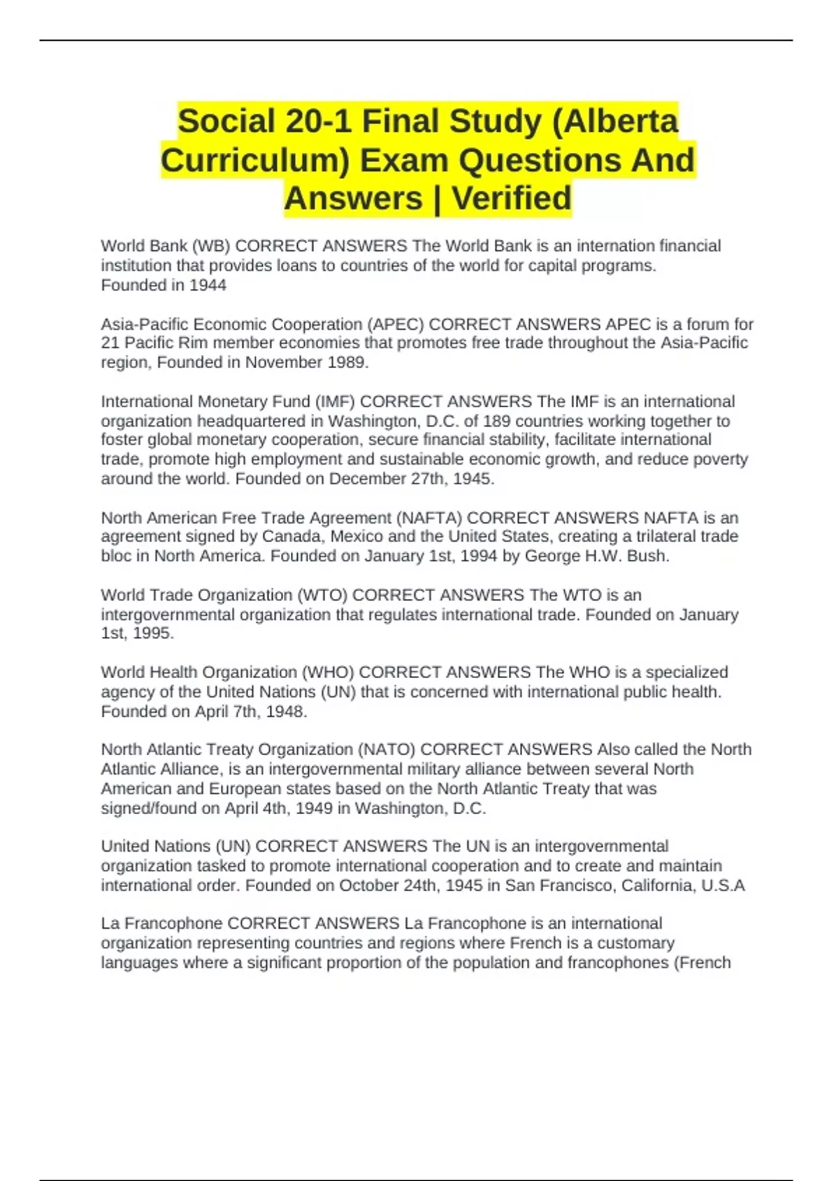 International Monetary Fund (IMF) CORRECT ANSWERS The IMF is an international