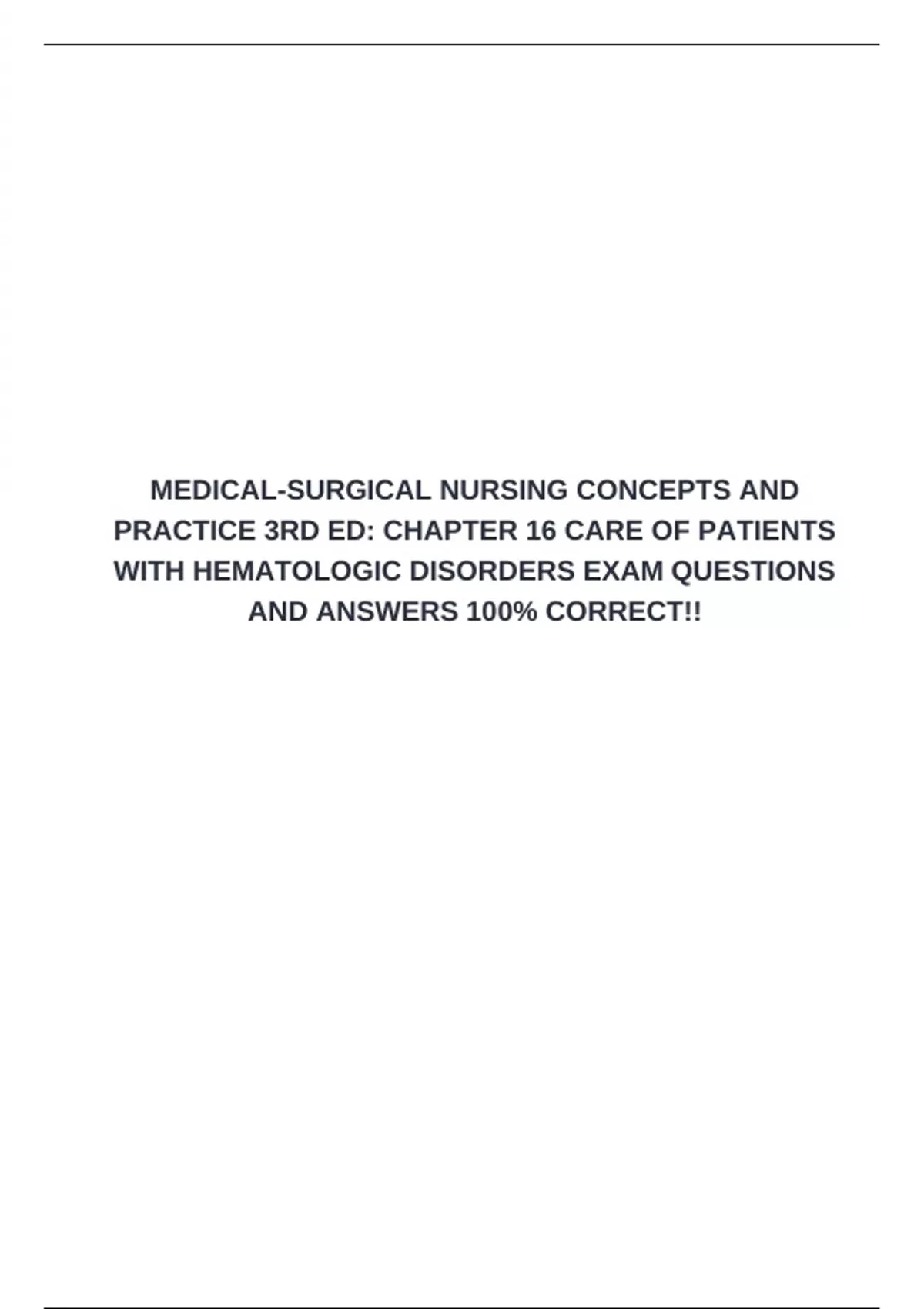 MEDICAL-SURGICAL NURSING CONCEPTS AND PRACTICE 3RD ED: CHAPTER 16 CARE OF PATIENTS WITH HEMATOLOGIC DISORDERS EXAM QUESTIONS AND ANSWERS 100% CORRECT!!