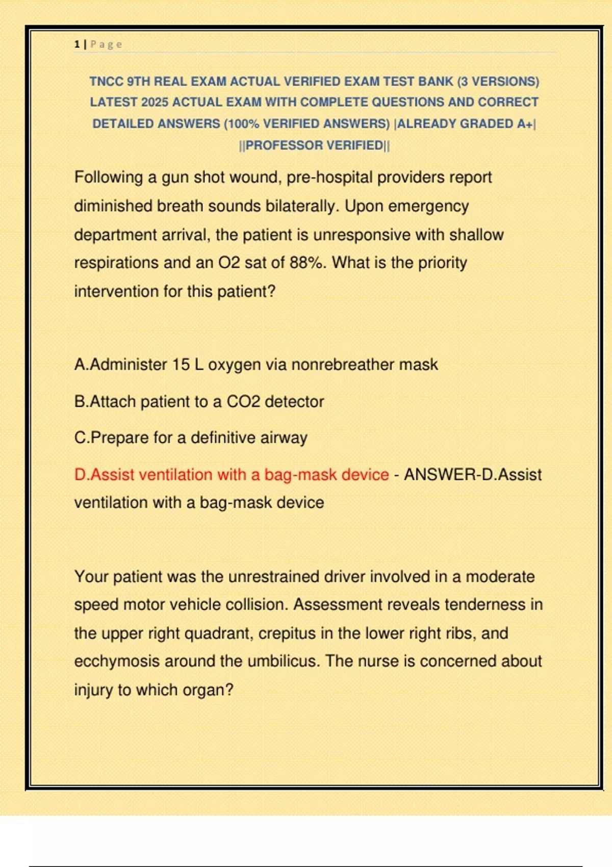 TNCC 9TH REAL EXAM ACTUAL VERIFIED EXAM TEST BANK (3 VERSIONS) LATEST 2025 ACTUAL EXAM WITH COMPLETE QUESTIONS AND CORRECT DETAILED ANSWERS (100% VERIFIED ANSWERS) |ALREADY GRADED A+| ||PROFESSOR VERIFIED||