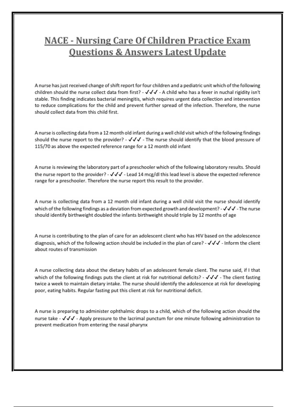 NACE - Nursing Care Of Children Practice Exam Questions & Answers Latest Update A nurse has just received change of shift report for four children and a pediatric unit which of the following children should the nurse collect data from first? - - A child who has a fever in nuchal rigidity isn't stable. This finding indicates bacterial meningitis, which requires urgent data collection and intervention to reduce complications for the child and prevent further spread of the infection. Therefore, the nurse should collect data from this child first. A nurse is collecting data from a 12 month old infant during a well child visit which of the following findings should the nurse report to the provider? - - The nurse should identify that the blood pressure of 115/70 as above the expected reference range for a 12 month old infant A nurse is reviewing the laboratory part of a preschooler which of the following laboratory results. Should the nurse report to the provider? - - Lead 14 mcg/dl this lead level is above the expected reference range for a preschooler. Therefore the nurse report this result to the provider. A nurse is collecting data from a 12 month old infant during a well child visit the nurse should identify which of the following findings as a deviation from expected growth and development? - - The nurse should identify birthweight doubled the infants birthweight should triple by 12 months of age