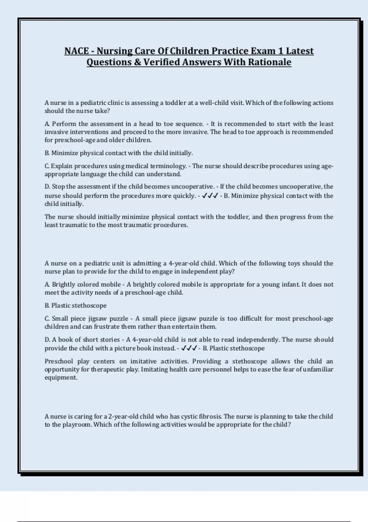 NACE - Nursing Care Of Children Practice Exam 1 Latest Questions & Verified Answers With Rationale