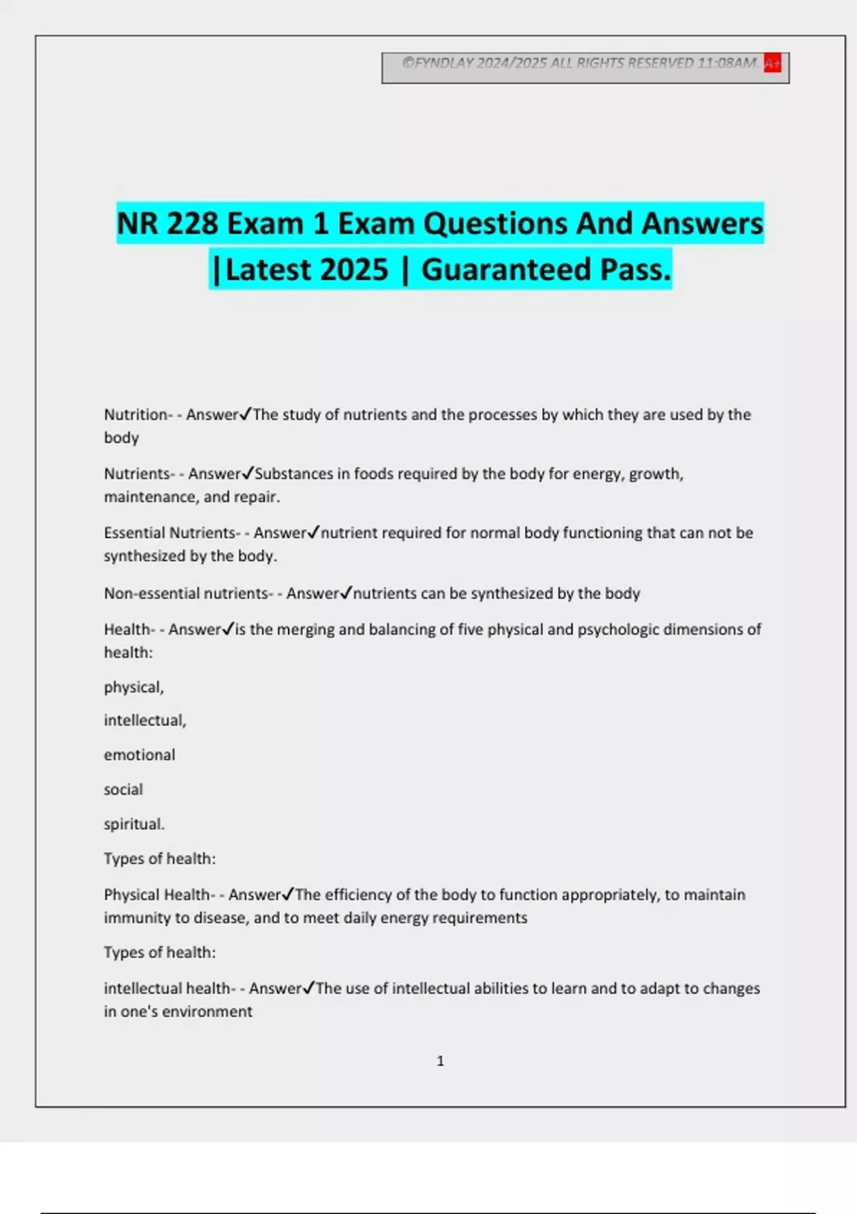 ©FYNDLAY 2024/2025 ALL RIGHTS RESERVED 11:08AM. A+ 1 NR 228 Exam 1 Exam Questions And Answers |Latest 2025 | Guaranteed Pass. Nutrition- - AnswerThe study of nutrients and the processes by which they are used by the body Nutrients- - AnswerSubstances in foods required by the body for energy, growth, maintenance, and repair. Essential Nutrients- - Answernutrient required for normal body functioning that can not be synthesized by the body. Non-essential nutrients- - Answernutrients can be synthesized by the body Health- - Answeris the merging and balancing of five physical and psychologic dimensions of health: physical, intellectual, emotional social spiritual. Types of health: Physical Health- - AnswerThe efficiency of the body to function appropriately, to maintain immunity to disease, and to meet daily energy requirements Types of health: intellectual health- - AnswerThe use of intellectual abilities to learn and to adapt to changes in one's environment ©FYNDLAY 2024/2025 ALL RIGHTS RESERVED 11:08AM. A+ 2 Types of health: Emotional health- - AnswerThe capacity to easily express or suppress emotions appropriately Types of health: Social health- - AnswerThe ability to interact with people in an acceptable manner and sustain relationships with family members, friends, and colleagues Types of health: Spiritual health - AnswerThe cultural beliefs that give purpose to human existence, found through faith in the teachings of organized religions, in an understanding of nature or science, or in an acceptance of the humanistic view of life Types of health: Environmental health- - AnswerThe external factors that affect our health and well-being, including the physical context within which one lives and works as affected by determinants of ethnicity, education, income, and occupation; and extending to the larger environment of safeguarding natural resources to reduce exposure to preventable hazards. Wellness- - Answeris a lifestyle that enhances our level of health health promotion- - Answerconsists of strategies used to increase the level of health of individuals, families, groups, and communities. --Knowledge --Techniques --Community supports disease prevention- - Answeris the recognition of a danger to health that could be reduced or alleviated through specific actions or changes in lifestyle behaviors. Primary, secondary, and tertiary prevention Role of nutrition Functions of Essential Nutrients in the Body- - AnswerProviding energy Regulating body processes Aiding growth and repair of b