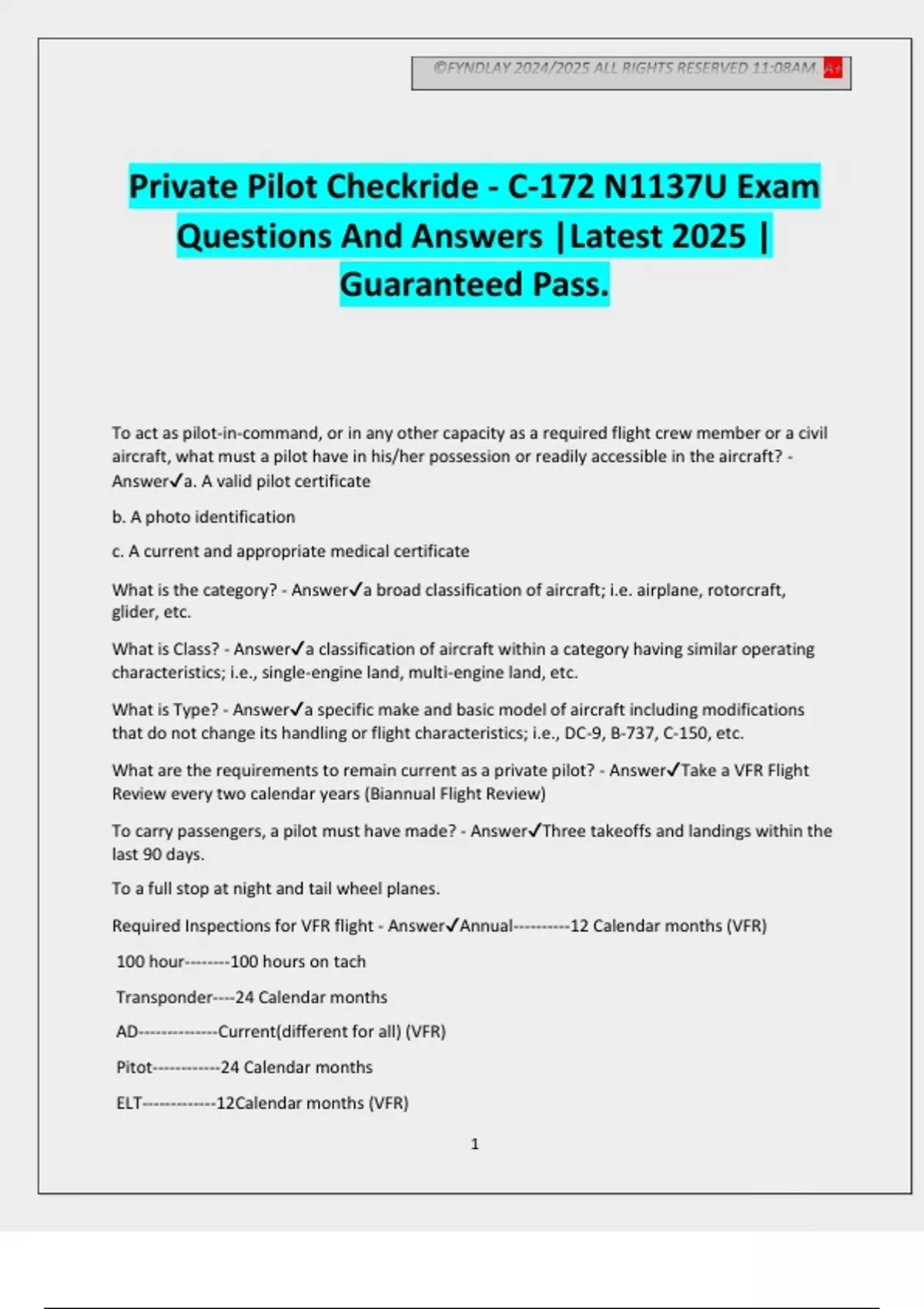 Required Inspections for VFR flight - Answer✔Annual----------12 Calendar months (VFR)