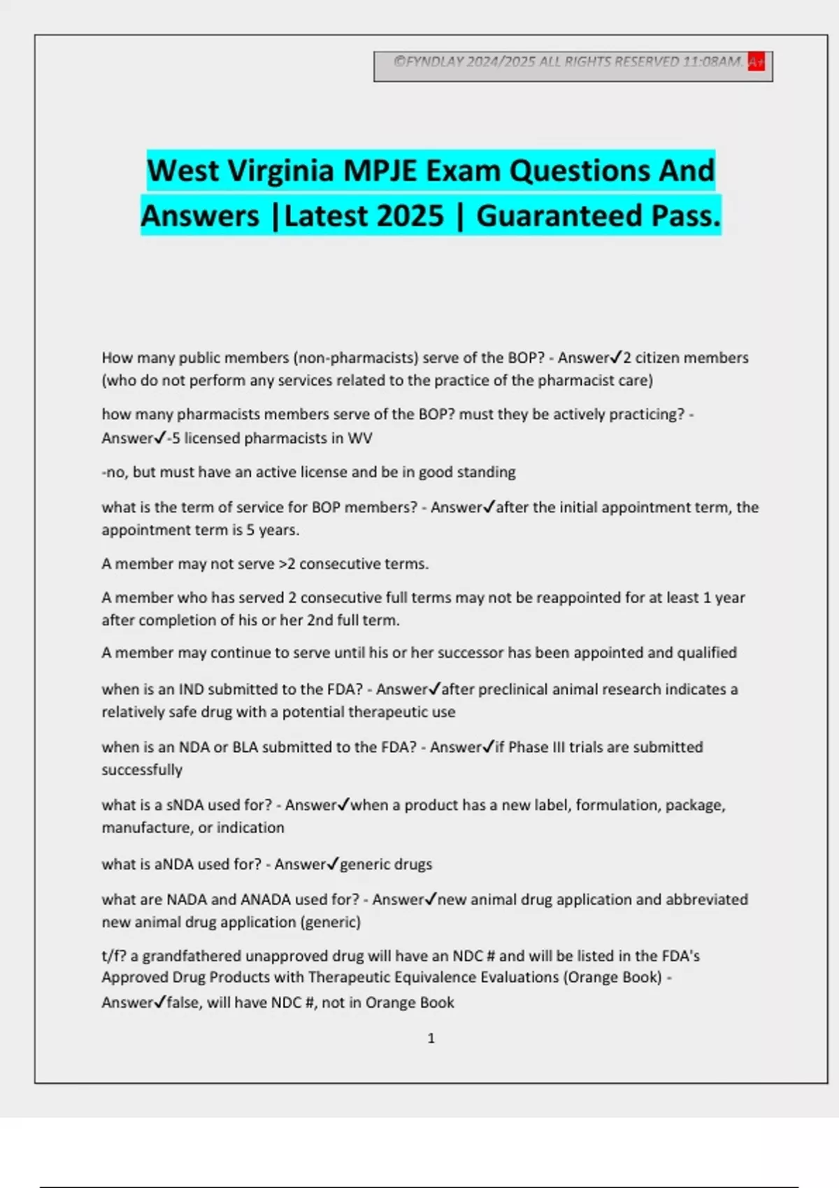 ©FYNDLAY 2024/2025 ALL RIGHTS RESERVED 11:08AM. A+ 1 West Virginia MPJE Exam Questions And Answers |Latest 2025 | Guaranteed Pass. How many public members (non-pharmacists) serve of the BOP? - Answer2 citizen members (who do not perform any services related to the practice of the pharmacist care) how many pharmacists members serve of the BOP? must they be actively practicing? - Answer-5 licensed pharmacists in WV -no, but must have an active license and be in good standing what is the term of service for BOP members? - Answerafter the initial appointment term, the appointment term is 5 years. A member may not serve >2 consecutive terms. A member who has served 2 consecutive full terms may not be reappointed for at least 1 year after completion of his or her 2nd full term. A member may continue to serve until his or her successor has been appointed and qualified when is an IND submitted to the FDA? - Answerafter preclinical animal research indicates a relatively safe drug with a potential therapeutic use when is an NDA or BLA submitted to the FDA? - Answerif Phase III trials are submitted successfully what is a sNDA used for? - Answerwhen a product has a new label, formulation, package, manufacture, or indication what is aNDA used for? - Answergeneric drugs what are NADA and ANADA used for? - Answernew animal drug application and abbreviated new animal drug application (generic) t/f? a grandfathered unapproved drug will have an NDC # and will be listed in the FDA's Approved Drug Products with Therapeutic Equivalence Evaluations (Orange Book) - Answerfalse, will have NDC #, not in Orange Book ©FYNDLAY 2024/2025 ALL RIGHTS RESERVED 11:08AM. A+ 2 _____ attempted to outlaw monopolies that blocked competition by nefarious methods, like price-fixing, deceptive marketing practices, and excluding competition from markets - AnswerSherman Antitrust Act of 1890 _____ means the drug itself is bad (drug quality is not up to standard) - Answeradulteration _____ means the drug label is inaccurate - Answermisbranding what law mandated accurate product labeling and required ingredients to meet standards of strength, quality, and purity in the USP and NF? - AnswerPure Food and Drug Act of 1906 (Wiley Act) which law made a clear distinction between OTC and Rx drugs? - AnswerDurham-Humphrey Amendment of 1951 what are legend drugs? - AnswerRx drugs what law required for the first time that manufacturers prove to the FDA that a drug is both safe and effective for the claims made in the product's labeling, and created the NDA and sNDA? - AnswerKefauver-Harris Amendment of 1962 what law required all Rx and OTC drugs to have a unique NDC number? - AnswerDrug Listing Act of 1972 what do the different segments of NDC number mean? - Answerfirst 4 or 5 numbers are labeler (manufacturer) code second is 3 or 4 numbers identifying strength, dosage, and formulation third is package code identifying package size and type and is 1 or 2 numbers t/f? the poison prevention and packaging act of 1970 deals with Rx drugs and the federal anti- tampering act of 1982 deals with OTC drugs - Answertrue what law made falsely billing Medicare and Medicaid a federal crime? - AnswerFederal False Claims Act of 1982 what law established the ANDA and the 505(b)(2) application (paper NDA) for generic drug approval, and established the Orange Book? - AnswerHatch-Waxman Act (Price Competition and Patent Act) of 1984 what law stated that all patients should receive counseling on their medications? - AnswerOmnibus Budget Reconciliation Act of 1990 (OBRA 90) how often are pharmacist licenses renewed in WV? What is the due date? - Answerbiennial, June 30 ©FYNDLAY 2024/2025 ALL RIGHTS RESERVED 11:08AM. A+ 3 what are the CE requirements for WV? - Answer30 hours per 2 years: 6 hours live, minimum of 3 hours of drug diversion 4 hours immunization if immunizing pharmacist what are the required intern hours for pharmacist licensure in WV? - Answer1500 hours how long is a WV intern license valid before it expires? - Answer1 year t/f? the intern hours for a WV license must be completed under the instruction and supervision of a pharmacist - Answertrue will the WVBOP accept internship hours completed outside of WV? - Answeryes, need a letter of credit from that state's BOP or from the school where you completed the experience up to 1/3 can be in a foreign country, need letter of credit from the responsible body are criminal background checks required in WV? - Answeras of July 1, 2017, all initial license applications for interns, pharmacists, technicians, and technician trainees require one what are the requirements for registration of pharmacy technicians in WV? - Answer-written app and pay fees -high school grad or GED -tech training program (or one provided by a pharmacy) approved by BOP like PTCB -pass exam approved by BOP -not alcohol or drug abuser -no felony within 10 years -no misdemeanor or felony related to pharmacy -designated as "technician-in-training" prior to meeting requirements can a pharmacist whose license has been denied, revoked, suspended, or restricted for disciplinary purposes in any jurisdiction be eligible to register as a tech? - Answerno what form is submitted by retail pharmacies, hospitals/clinics, practitioners, teaching institutions, or mid-level practitioners to apply for a DEA number? - AnswerDEA Form 224 t/f? there are different registration forms for companies involved w/ manufacturing and distributing controlled substances than for individuals and institutions - Answertrue what form is submitted by manufacturers, distributors, researchers, analytical laboratories, importers, and exporters to apply for