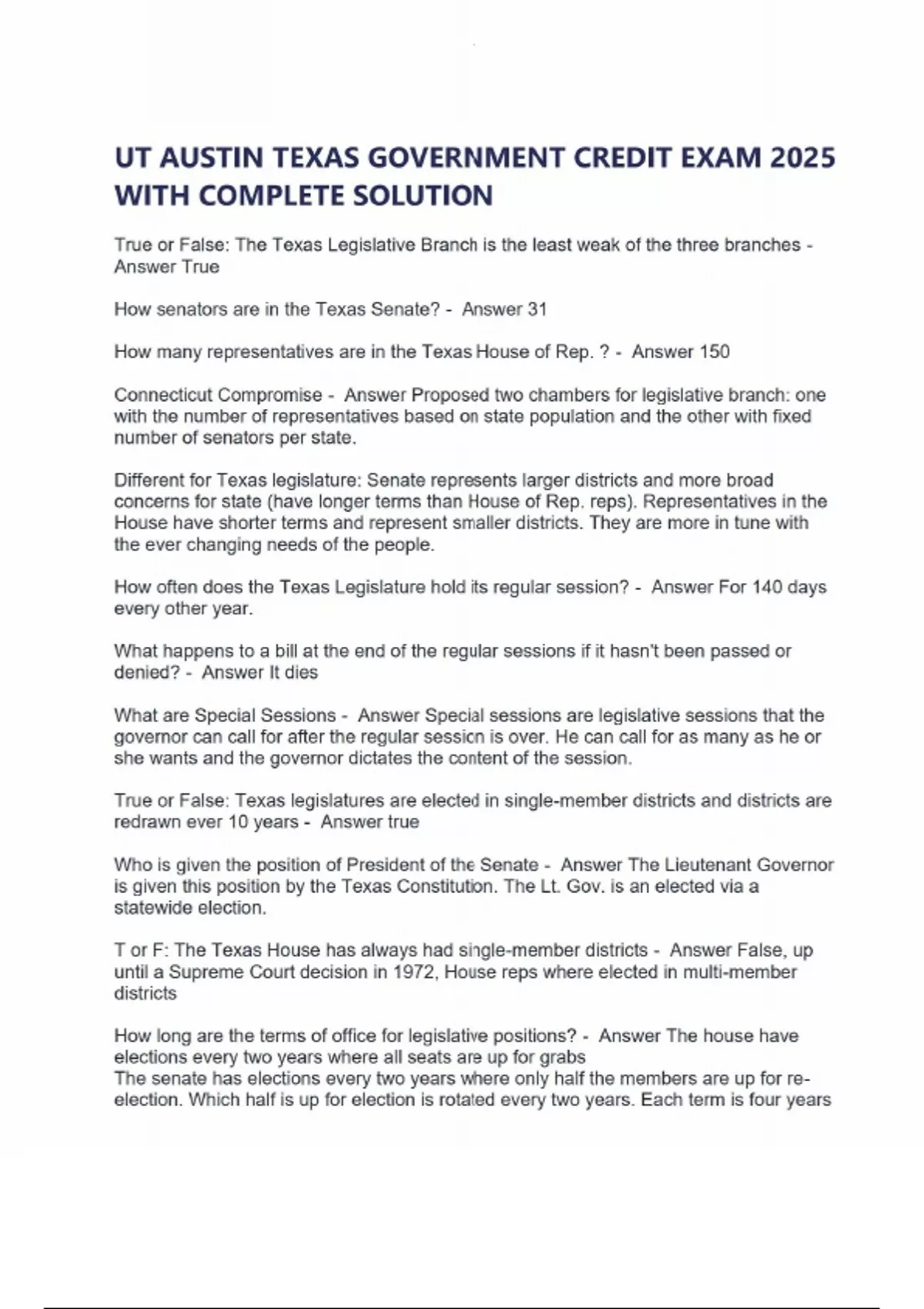 UT AUSTIN TEXAS GOVERNMENT CREDIT EXAM 2025 WITH COMPLETE SOLUTION True or False: The Texas Legislative Branch is the least weak of the three branches - Answer True How senators are in the Texas Senate? - Answer 31 How many representatives are in the Texas House of Rep. ? - Answer 150 Connecticut Compromise - Answer Proposed two chambers for legislative branch: one with the number of representatives based on state population and the other with fixed number of senators per state. Different for Texas legislature: Senate represents larger districts and more broad concerns for state (have longer terms than House of Rep. reps). Representatives in the House have shorter terms and represent smaller districts. They are more in tune with the ever changing needs of the people. How often does the Texas Legislature hold its regular session? - Answer For 140 days every other year. What happens to a bill at the end of the regular sessions if it hasn't been passed or denied? - Answer It dies What are Special Sessions - Answer Special sessions are legislative sessions that the governor can call for after the regular session is over. He can call for as many as he or she wants and the governor dictates the content of the session. True or False: Texas legislatures are elected in single-member districts and districts are redrawn ever 10 years - Answer true Who is given the position of President of the Senate - Answer The Lieutenant Governor is given this position by the Texas Constitution. The Lt. Gov. is an elected via a statewide election. T or F: The Texas House has always had single-member districts - Answer False, up until a Supreme Court decision in 1972, House reps where elected in multi-member districts How long are the terms of office for legislative positions? - Answer The house have elections every two years where all seats are up for grabs The senate has elections every two years where only half the members are up for re-election. Which half is up for election is rotated every two years. Each term is four years