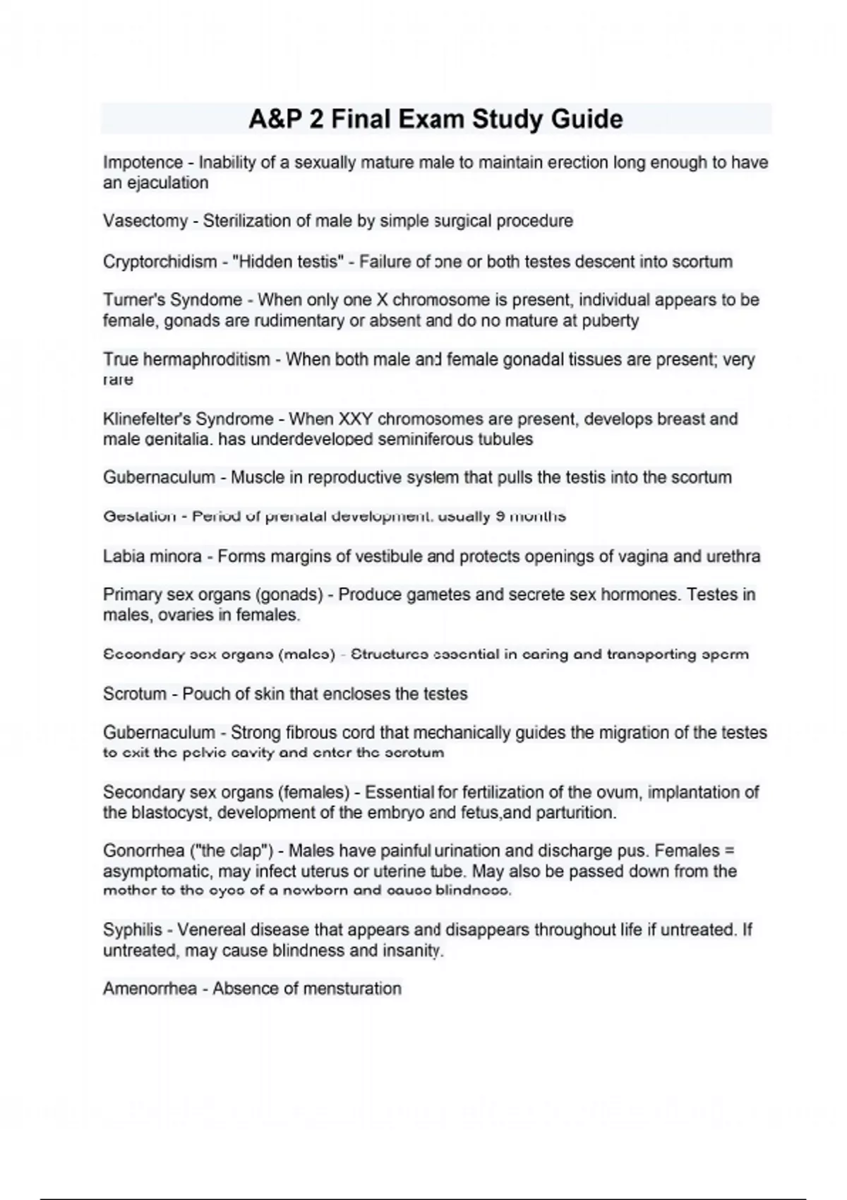 Impotence - Inability of a sexually mature male to maintain erection long enough to have an ejaculation Vasectomy - Sterilization of male by simple surgical procedure Cryptorchidism - "Hidden testis" - Failure of one or both testes descent into scortum Turner's Syndome - When only one X chromosome is present, individual appears to be female, gonads are rudimentary or absent and do no mature at puberty True hermaphroditism - When both male and female gonadal tissues are present; very rare Klinefelter's Syndrome - When XXY chromosomes are present, develops breast and male genitalia, has underdeveloped seminiferous tubules Gubernaculum - Muscle in reproductive system that pulls the testis into the scortum Gestation - Period of prenatal development: usually 9 months Labia minora - Forms margins of vestibule and protects openings of vagina and urethra Primary sex organs (gonads) - Produce gametes and secrete sex hormones. Testes in males, ovaries in females. Secondary sex organs (males) - Structures essential in caring and transporting sperm Scrotum - Pouch of skin that encloses the testes Gubernaculum - Strong fibrous cord that mechanically guides the migration of the testes to exit the pelvic cavity and enter the scrotum Secondary sex organs (females) - Essential for fertilization of the ovum, implantation of the blastocyst, development of the embryo and fetus,and parturition. Gonorrhea ("the clap") - Males have painful urination and discharge pus. Females = asymptomatic, may infect uterus or uterine tube. May also be passed down from the mother to the eyes of a newborn and cause blindness. Syphilis - Venereal disease that appears and disappears throughout life if untreated. If untreated, may cause blindness and insanity. Amenorrhea - Absence of mensturation Prostatic carcinoma - Second leading cause of death from cancer in males in the U.S. Common in males over 60. Cancer of prostate gland Normal amenorrhea - Follows menopause, occurs during pregnancy, and may occur during lactation Primary amenorrhea - When a woman has never mensturated. Usually accompanied by failure of development of secondary sexual characteristics. Secondary amenorrhea - Cessation of mensturation of a woman who had normal menstural cycles and have not went through menopause nor are they pregnant. May be caused by temporary stress, fatigue, poor nutrition or sickness. Mastectomy - Removal of the breast and and perhaps associated tissues Simple mastectomy - Removal of the entire breast but not underlying lymph nodes Modified radical mastectomy - Complete removal of the breast, lymphatic drainage, and perhaps pectoralis major muscle Radical mastectomy - Similar to modified radical mastectomy except the pectoralis major muscle is ALWAYS removed. as well as axillary lymph nodes and adjacent connective tissue. Amniocentesis - A technique used to obtain amniotic fluid with a syringe to determine fetal maturity. Also can help predict serious disorders like Down's syndrome and Gaucher's disease. Bulbourethral glands - Secrete fluid that lubricates urethra and end of penis Prostate gland - Secretes alkaline fluid that helps neutralize acidic seminal fluid and enhances motility of spermatozoa Seminiferous tubules - Produce spermatozoa in testes. Functional unit of the testes! Ductus deferentia - Store spermatozoa and convey spermatozoa to ejaculatory ducts. Ejaculatory ducts - Receive spermatozoa and additives to produce seminal fluid Uterine tubes - Convey ovum toward uterus, site of fertilization, and convey developing pre-embryo to uterus Uterus - Site of implantation, protects and sustains life of embryo and fetus during pregnancy, and has an active role in parturition Vestibular glands - Secrete fluid that moistens and lubricates vestibule and vaginal opening during intercourse Vestibule - Cleft between labia minora that includes vaginal and urethral openings Body of sperm - Contains numerous mitochondria spiraled around a filamentous core. Mitochondria provide energy for locomotion Acrosome - Contains enzymes that help sperm penetrate into ovum Prolactin - Promotes secretion of milk from mammary glands (lactation) Diabetes Mellitus - One of the most common endocrine disorders Placenta - Responsible for nutrient and waste exchange between fetus and mother. Secretes at least 3 hormones to aid in maintaining pregnancy Goiter - An enlargement of thyroid gland. May be caused by insufficient amounts of iodine in diet Aspiration - The act of inhaling or drawing something into the lungs or respiratory passages Tracheotomy - The surgical opening of the trachea that provides an alternative route for air to reach the lungs Silicosis - A disorder caused by inhalation of sharp-edged particles of dust that cut small holes in alveoli of the lungs causing blood to accumulate in the alveoli Cystic fibrosis - Causes secretion of abnormally viscous mucous that clogs the respiratory passages, providing a breeding ground for airborne bacteria that predisposes the person to respiratory infections Emphysema - What is distinguished by permanent enlargement of the alveoli, accompanied by destruction of the alveolar walls? Eupena - Refers to the normal respiratory rate and rhythm Hypoxia - Inadequate delivery of oxygen to the tissues Coma, death, or too many free radicals - Excessively high concentrations of oxygen can lead to Nitrogen - The most abundant gas in the atmosphere is Hiccups - Caused by sudden inspirations resulting from spasms in the diaphragm.