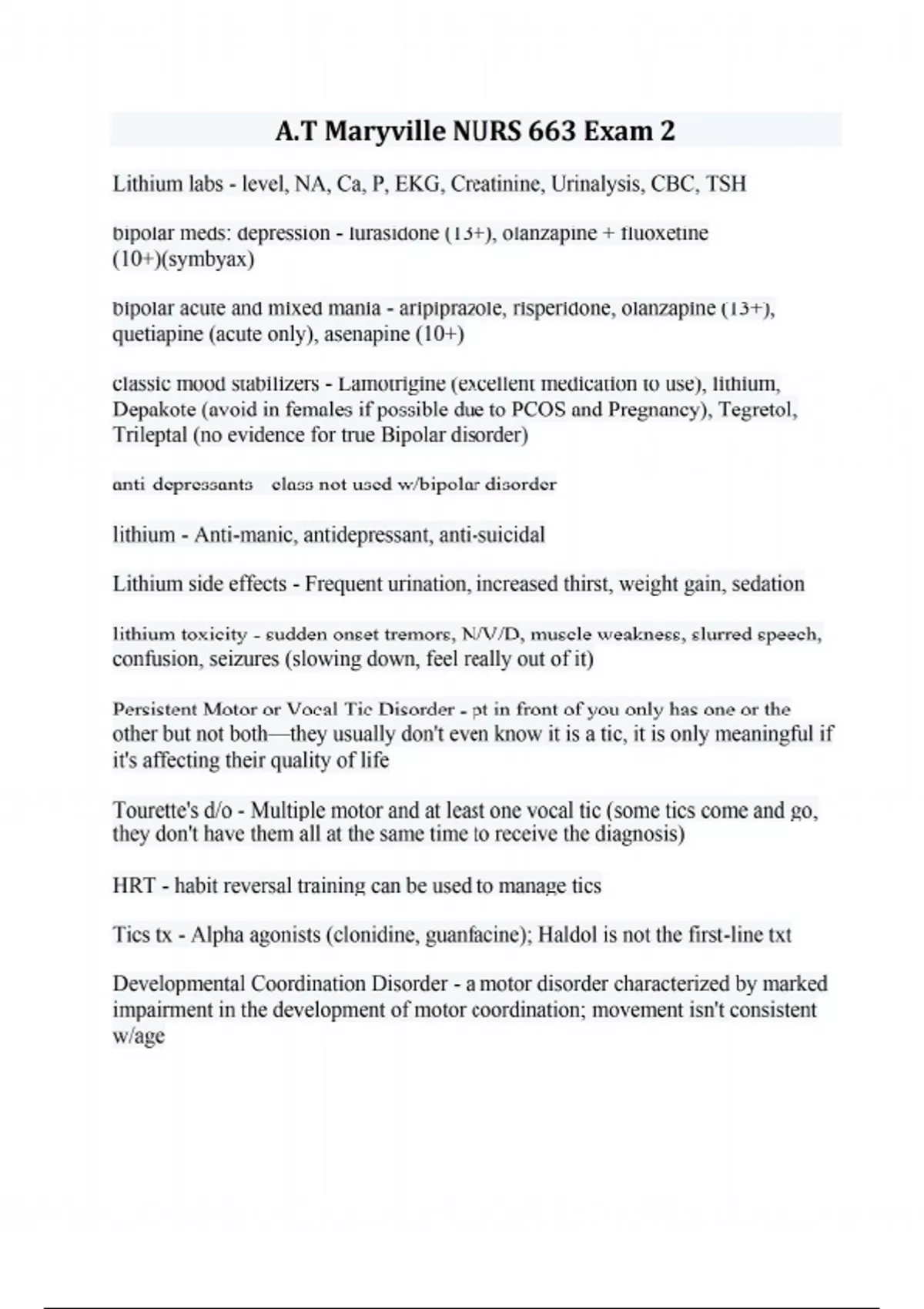 Lithium labs - level, NA, Ca, P, EKG, Creatinine, Urinalysis, CBC, TSH bipolar meds: depression - lurasidone (13+), olanzapine + fluoxetine (10+)(symbyax) bipolar acute and mixed mania - aripiprazole, risperidone, olanzapine (13+), quetiapine (acute only), asenapine (10+) classic mood stabilizers - Lamotrigine (excellent medication to use), lithium, Depakote (avoid in females if possible due to PCOS and Pregnancy), Tegretol, Trileptal (no evidence for true Bipolar disorder) anti-depressants - class not used w/bipolar disorder lithium - Anti-manic, antidepressant, anti-suicidal Lithium side effects - Frequent urination, increased thirst, weight gain, sedation lithium toxicity - sudden onset tremors, N/V/D, muscle weakness, slurred speech, confusion, seizures (slowing down, feel really out of it) Persistent Motor or Vocal Tic Disorder - pt in front of you only has one or the other but not both—they usually don't even know it is a tic, it is only meaningful if it's affecting their quality of life Tourette's d/o - Multiple motor and at least one vocal tic (some tics come and go, they don't have them all at the same time to receive the diagnosis) HRT - habit reversal training can be used to manage tics Tics tx - Alpha agonists (clonidine, guanfacine); Haldol is not the first-line txt Developmental Coordination Disorder - a motor disorder characterized by marked