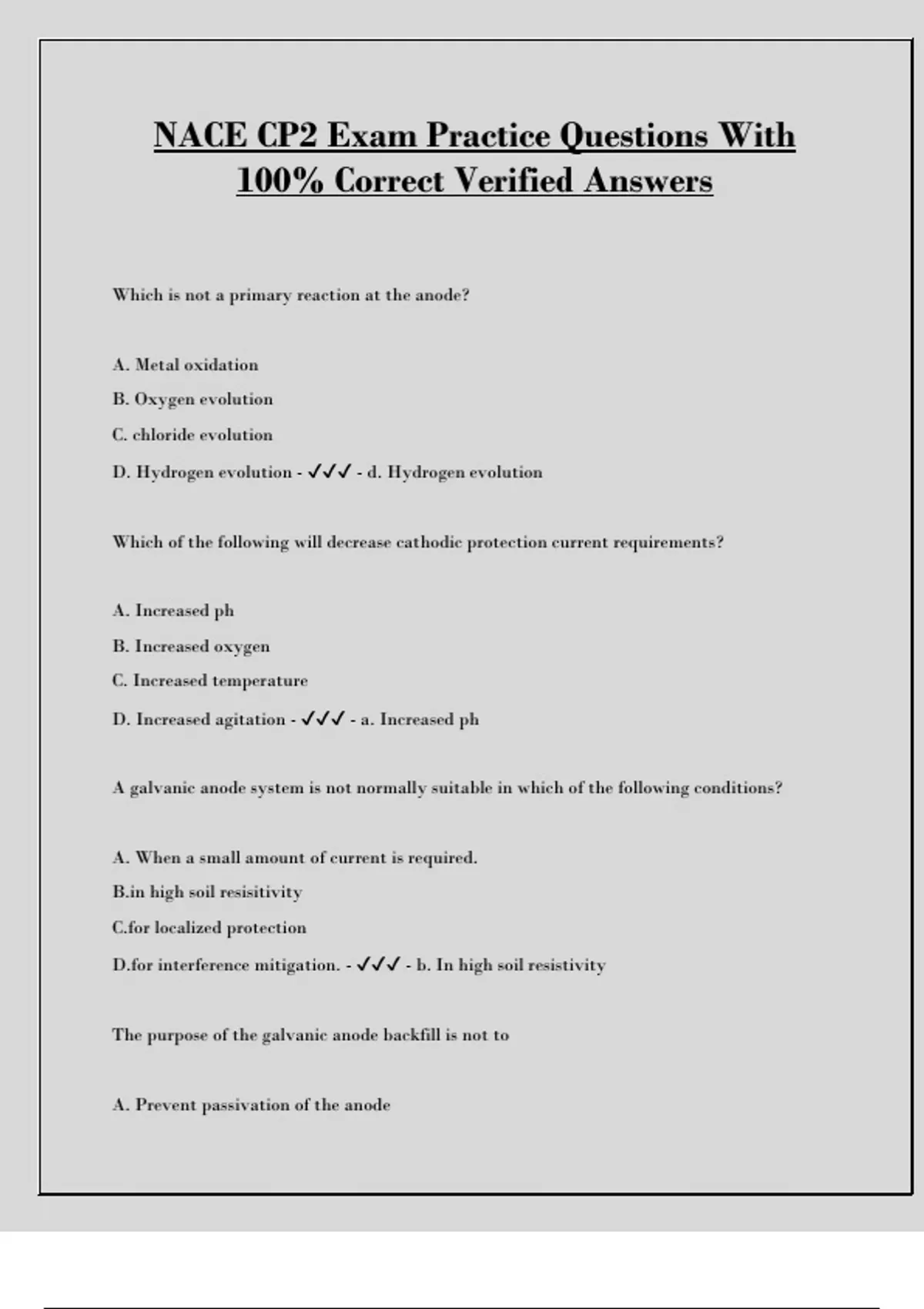 NACE CP2 Exam Practice Questions With 100% Correct Verified Answers Which is not a primary reaction at the anode? A. Metal oxidation B. Oxygen evolution C. chloride evolution D. Hydrogen evolution - - d. Hydrogen evolution Which of the following will decrease cathodic protection current requirements? A. Increased ph B. Increased oxygen C. Increased temperature D. Increased agitation - - a. Increased ph A galvanic anode system is not normally suitable in which of the following conditions? A. When a small amount of current is required. B.in high soil resisitivity C.for localized protection D.for interference mitigation. - - b. In high soil resistivity