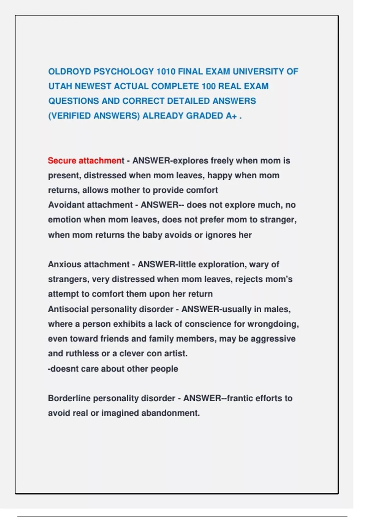 OLDROYD PSYCHOLOGY 1010 FINAL EXAM UNIVERSITY OF UTAH NEWEST ACTUAL COMPLETE 100 REAL EXAM QUESTIONS AND CORRECT DETAILED ANSWERS (VERIFIED ANSWERS) ALREADY GRADED A+ .