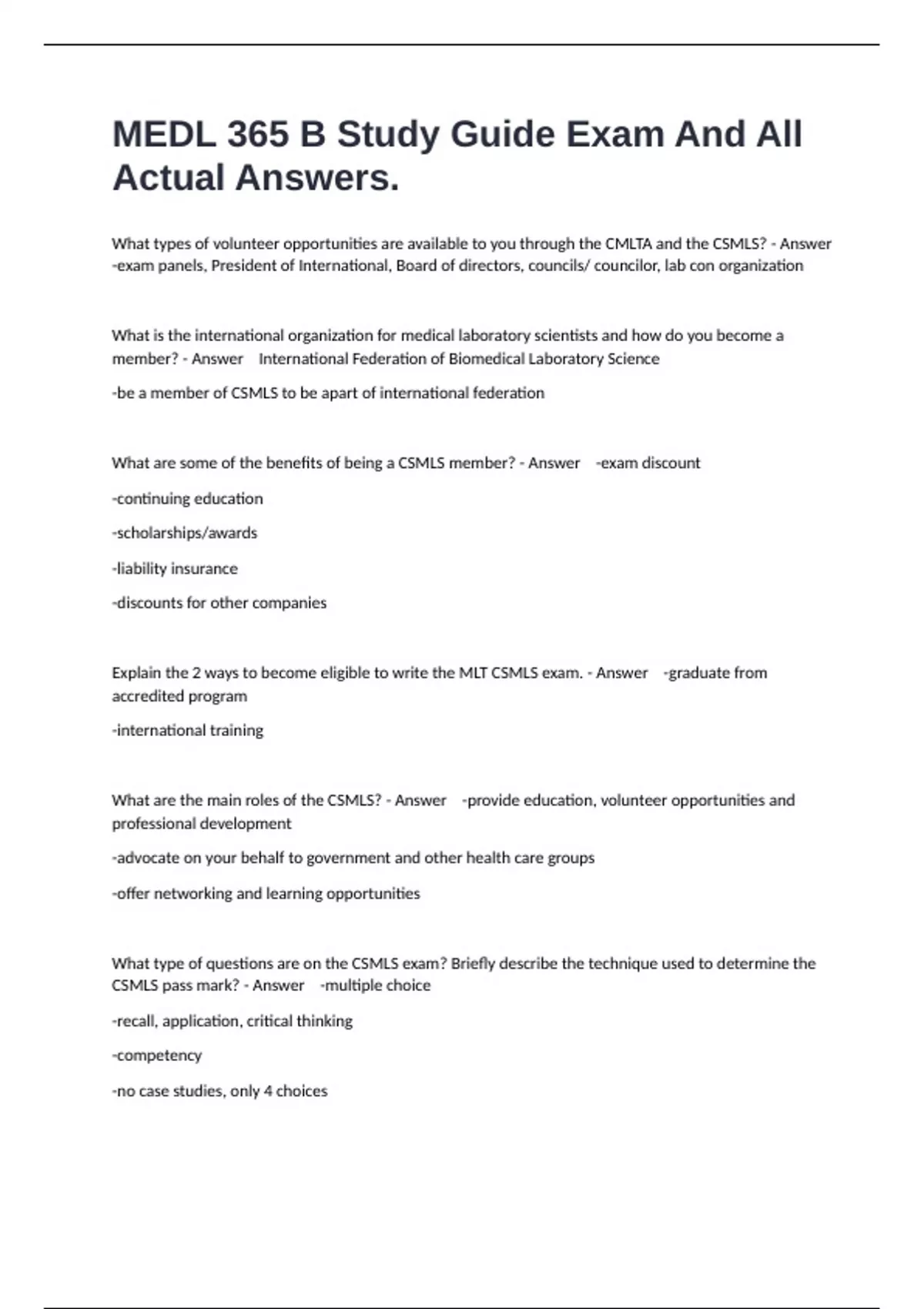 What types of volunteer opportunities are available to you through the CMLTA and the CSMLS? - Answer -exam panels, President of International, Board of directors, councils/ councilor, lab con organization What is the international organization for medical laboratory scientists and how do you become a member? - Answer International Federation of Biomedical Laboratory Science -be a member of CSMLS to be apart of international federation What are some of the benefits of being a CSMLS member? - Answer -exam discount -continuing education -scholarships/awards -liability insurance -discounts for other companies Explain the 2 ways to become eligible to write the MLT CSMLS exam. - Answer -graduate from accredited program -international training What are the main roles of the CSMLS? - Answer -provide education, volunteer opportunities and professional development -advocate on your behalf to government and other health care groups -offer networking and learning opportunities What type of questions are on the CSMLS exam? Briefly describe the technique used to determine the CSMLS pass mark? - Answer -multiple choice -recall, application, critical thinking -competency -no case studies, only 4 choices