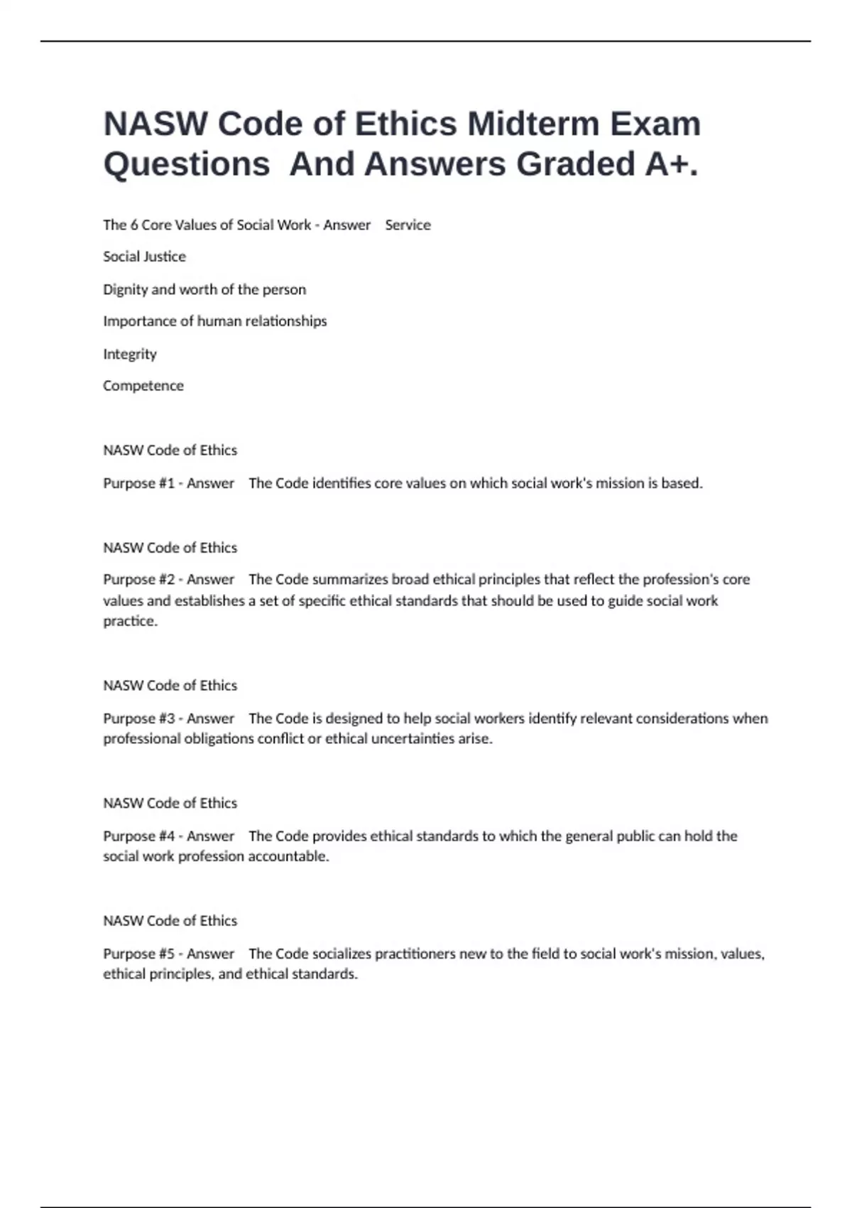 Purpose #1 - Answer The Code identifies core values on which social work's mission is based.