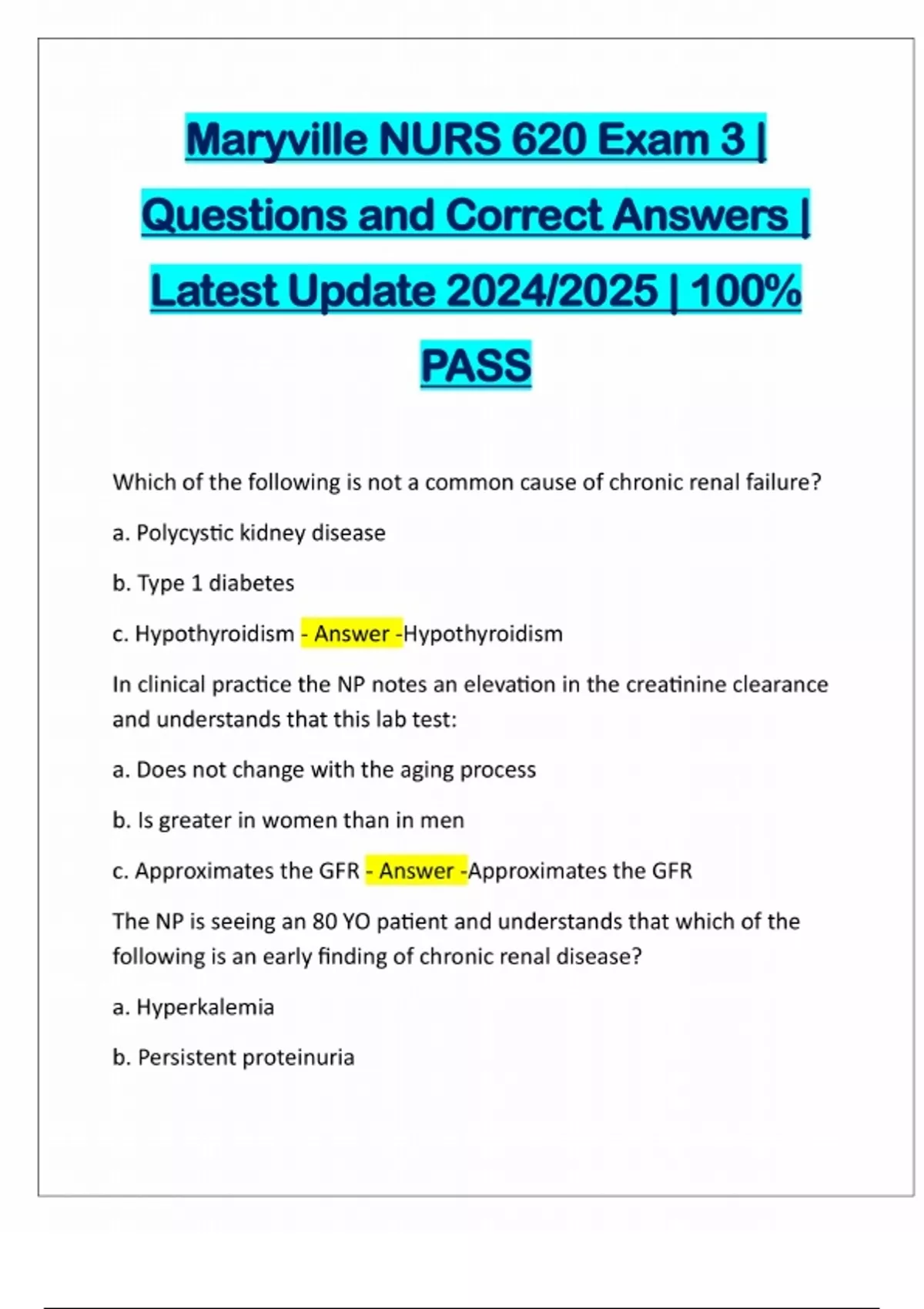 Maryville NURS 620 Exam 3 | Questions and Correct Answers | Latest Update 2024/2025 | 100% PASS Which of the following is not a common cause of chronic renal failure? a. Polycystic kidney disease b. Type 1 diabetes c. Hypothyroidism - Answer -Hypothyroidism In clinical practice the NP notes an elevation in the creatinine clearance and understands that this lab test: a. Does not change with the aging process b. Is greater in women than in men c. Approximates the GFR - Answer -Approximates the GFR The NP is seeing an 80 YO patient and understands that which of the following is an early finding of chronic renal disease? a. Hyperkalemia b. Persistent proteinuriac. Elevated creatinine level - Answer -Persistent proteinuria Which of the following would allow you to rule out a diagnosis o