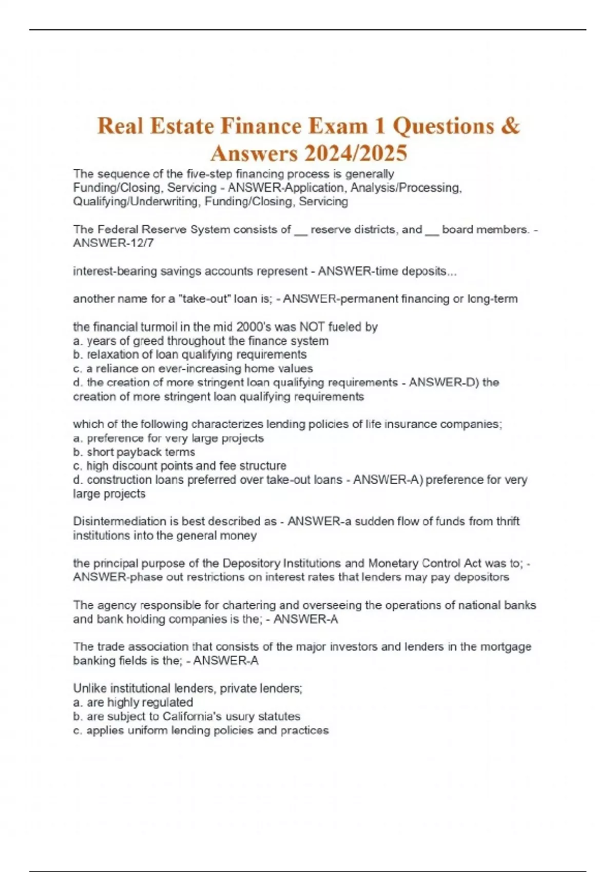 Real Estate Finance Exam 1 Questions & Answers 2024/2025 The sequence of the five-step financing process is generally Funding/Closing, Servicing - ANSWER-Application, Analysis/Processing, Qualifying/Underwriting, Funding/Closing, Servicing The Federal Reserve System consists of __ reserve districts, and __ board members. - ANSWER-12/7 interest-bearing savings accounts represent - ANSWER-time deposits... another name for a "take-out" loan is; - ANSWER-permanent financing or long-term the financial turmoil in the mid 2000's was NOT fueled by a. years of greed throughout the finance system b. relaxation of loan qualifying requirements c. a reliance on ever-increasing home values d. the creation of more stringent loan qualifying requirements - ANSWER-D) the creation of more stringent loan qualifying requirements which of the following characterizes lending policies of life insurance companies; a. preference for very large projects b. short payback terms c. high discount points and fee structure d. construction loans preferred over take-out loans - ANSWER-A) preference for very large projects Disintermediation is best described as - ANSWER-a sudden flow of funds from thrift institutions into the general money the principal purpose of the Depository Institutions and Monetary Control Act was to; - ANSWER-phase out restrictions on interest rates that lenders may pay depositors The agency responsible for chartering and overseeing the operations of national banks and bank holding companies is the; - ANSWER-A The trade association that consists of the major investors and lenders in the mortgage banking fields is the; - ANSWER-A Unlike institutional lenders, private lenders; a. are highly regulated b. are subject to California's usury statutes c. applies uniform lending policies and practices d. makes only second trust deed loans - ANSWER-B) are subject to California's usury statutes a purchase money loan is best illustrated by; - ANSWER-seller carrying back a first trust deed. Lending characteristics of private lenders include; a. high degree of sophistication in loan decisions b. making primarily first trust deed loans c. charging relatively low interest rates d. short-term repayment schedules - ANSWER-D) short-term repayment schedules an association of two or more parties who combine their financial resources for achieving specific investment objectives is best illustrated by a; a. real estate investment trust b. syndication c. general partnership d. limited partnership - ANSWER-B) syndication All of the following statements regarding the discount rate are true except; a. the higher the discount rate charged the higher the interest rate charged to the borrower b. the discount rate is the charge for overnight borrowing from the Fed. c. any change in the discount rate immediately affects long term mortgage rated d. the lower the discount rates the greater likelihood is of lower borrowing rated by consumers - ANSWER-C) any change in the discount rate immediately affects long term mortgage rated which of the following receive their capital primarily from gifts, and are a good source for sale-leaseback financing a. state-chartered credit unions b. labor unions c. endowment funds d. estate funds - ANSWER-C) endowment funds alternative mortgage instruments (AIMs) are financing vehicles that a. are universally standardized b. offers an alternative to fixed-rate instruments c. call for level payments throughout the life of the loan d. call for 30-year repayment schedules - ANSWER-B) offer an alternative to fixed-rate instruments The principal objective of AMIs is to; a. transfers the risk of rising interest rates from borrower to lender b. transfers the risk of rising interest rates from lender to borrower c. overcome loss of purchasing power through inflation d. assures a steady flow of funds in gyrating capital markets - ANSWER-B) transfer the risk of rising interest rates from lender to borrower Regarding a negative amortization loan, which statement is untrue; a. initial payments are not sufficient to satisfy interest payment requirements b. initial payments are adequate to satisfy principal and interest payment requirements c. the outstanding loan balance generally grows larger d. recasting usually occurs after the loan balance reaches 120% of the original debt - ANSWER-D) recasting usually occurs after the loan balance reaches 120% of the original debt Regulation Z of the Truth-in-Lending law requires lenders who offer ARM loans to disclose to borrowers; a. what index is being used b. how rates and margins interact c. payment adjustment periods d. all of the above - ANSWER-D) all of the above: -what index is being used -payment adjustment periods -how rates and margins interact The causes for mortgage interest rate changes include; a. inflation b. supply and demand factors c. federal reserve actions d. all of the foregoing is true - ANSWER-B) supply and demand factors where a loan contains negative amortization; a. monthly payments decrease over time b. equity actually shrinks during the initial years c. the original term of loan is extended d. deferred interest is deducted from principal - ANSWER-B? the following statement is true regarding straight notes versus installment notes; a. the straight note is an interest only note b. the straight note is fully amortized c. the installment note is an interest only note d. none of the above are true - ANSWER-A) straight not is an interest only note the chief benefit to the use of a reverse annuity mortgage is the recipient's ability to; a. leave property free and clear out heirs b. converts one's equity in a home into a rental property c. exchanges the property's value into a lifetime annuity Continues...