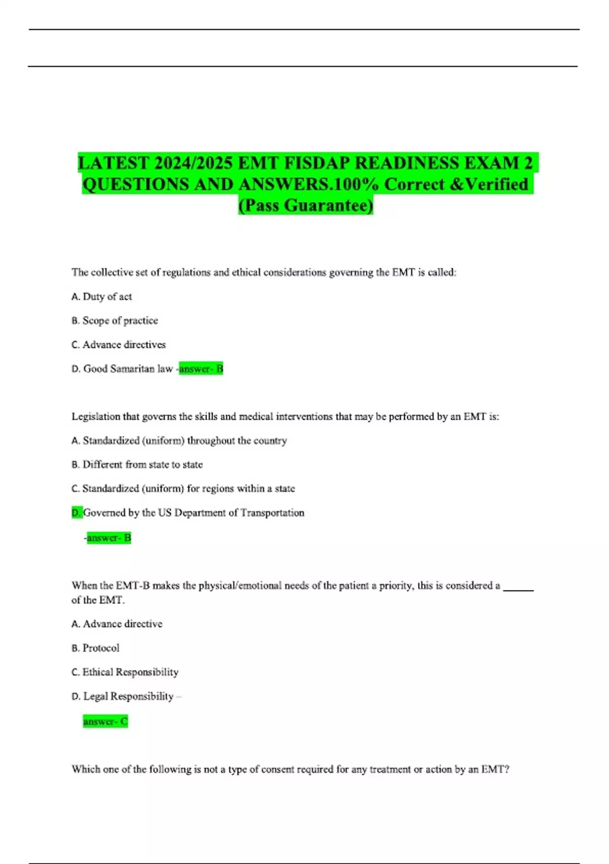 LATEST 2024/2025 EMT FISDAP READINESS EXAM 2 QUESTIONS AND ANSWERS.100% Correct &Verified (Pass Guarantee)