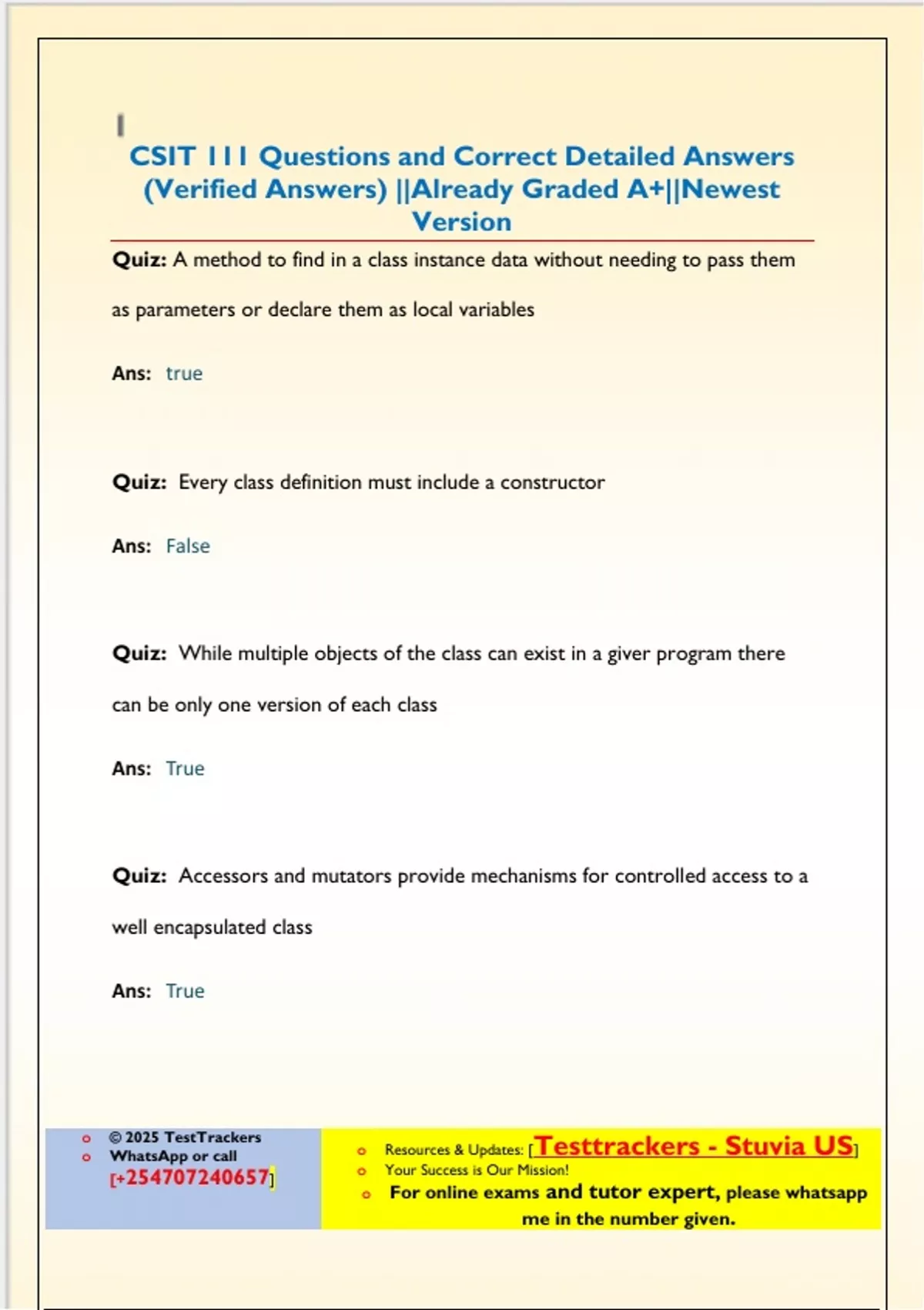 Quiz: A method to find in a class instance data without needing to pass them as parameters or declare them as local variables Ans: true Quiz: Every class definition must include a constructor Ans: False Quiz: While multiple objects of the class can exist in a giver program there can be only one version of each class Ans: True Quiz: Accessors and mutators provide mechanisms for controlled access to a well encapsulated class Ans: True o © 2025 TestTrackers o or call [] o Resources & Updates: [Testtrackers - Stuvia US] o Your Success is Our Mission! o For online exams and tutor expert, please me in the number given. Quiz: All Java classes must contain a main method which is the first method executed when the java class is called upon Ans: False Quiz: As In The other memebers of the C family languages C C++ C# java interprets a zero value as false and a non zero value as true Ans: True Quiz: In java selection statements consist of the if and if else statements Ans: False Quiz: In Java, the symbol "=" and the symbol "==" are used synonymously (interchangeably). Ans: False Quiz: When com