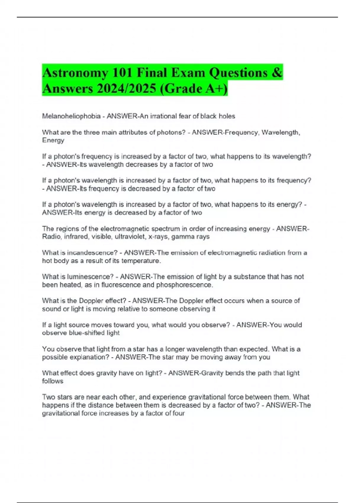 Astronomy 101 Final Exam Questions & Answers 2024/2025 (Grade A+) Melanoheliophobia - ANSWER-An irrational fear of black holes What are the three main attributes of photons? - ANSWER-Frequency, Wavelength, Energy If a photon's frequency is increased by a factor of two, what happens to its wavelength? - ANSWER-Its wavelength decreases by a factor of two If a photon's wavelength is increased by a factor of two, what happens to its frequency? - ANSWER-Its frequency is decreased by a factor of two If a photon's wavelength is increased by a factor of two, what happens to its energy? - ANSWER-Its energy is decreased by a factor of two The regions of the electromagnetic spectrum in order of increasing energy - ANSWER-Radio, infrared, visible, ultraviolet, x-rays, gamma rays What is incandescence? - ANSWER-The emission of electromagnetic radiation from a hot body as a result of its temperature. What is luminescence? - ANSWER-The emission of light by a substance that has not been heated, as in fluorescence and phosphorescence. What is the Doppler effect? - ANSWER-The Doppler effect occurs when a source of sound or light is moving relative to someone observing it If a light source moves toward you, what would you observe? - ANSWER-You would observe blue-shifted light You observe that light from a star has a longer wavelength than expected. What is a possible explanation? - ANSWER-The star may be moving away from you What effect does gravity have on light? - ANSWER-Gravity bends the path that light follows Two stars are near each other, and experience gravitational force between them. What happens if the distance between them is decreased by a factor of two? - ANSWER-The gravitational force increases by a factor of four Two stars are near each other, and experience gravitational force between them. What happens if the mass of one star is increased by a factor of two? - ANSWER-The gravitational force increases by a factor of two Two stars are near each other, and experience gravitational force between them. What does Newton's third law say about them? - ANSWER-The stars each experience the same force, but in opposite directions What is weight? - ANSWER-Weight is the apparent force due to gravity as something is pulled against a planet's surface If a thing is initially at rest, what happens to its kinetic energy as it is gravitationally pulled toward a massive object - ANSWER-Its gravitational potential energy is changed into kinetic energy When does an object have "escape velocity"? - ANSWER-Escape velocity is when an object has enough kinetic energy to escape a gravitational field What is a dark star? - ANSWER-A dark star has a surface escape velocity equal to the speed of light What is the relationship between a dark star and a black hole? - ANSWER-A dark star with a stable surface does not exist in nature, while a black hole with an event horizon at the same place as the dark star's surface exists and can be observed. What phenomena might black holes help explain? - ANSWER-Dark matter, dark energy What is the event horizon of a black hole? - ANSWER-The event horizon is the radius within which light cannot escape a black hole What is a star? - ANSWER-A star is a self-gravitating body of gas which is massive enough to sustain fusion What is hydrostatic equilibrium in a star? - ANSWER-Hydrostatic equilibrium is when gas pressure balances gravity What is luminosity? - ANSWER-Luminosity is a measure of the light emitted by a star What is apparent brightness? - ANSWER-The observed brightness of a star What is the phenomenon where stars produce light based on their heat? - ANSWER-Blackbody radiation What are differences between fusion and fission? - ANSWER-Fission is when a nucleus is split, and fusion is when nuclei merge What is one direct piece of evidence for fusion in the Sun? - ANSWER-The streams of neutrinos flowing outwards from the Sun's core Where does the energy from fusion come from? - ANSWER-The energy from fusion is created by the conversion of mass to energy through the equation E=mc^2 Which term describes the situation when an element is unable to release energy through either fission or fusion? - ANSWER-The iron catastrophe Identify the three methods of energy transfer. - ANSWER-Convection, conduction, radiation Name the regions of the sun in their order from inward to outward. - ANSWER-Thermonuclear core, convective zone, photosphere, chromosphere, corona If you see the spectrum of a distant star and it appears as a rainbow of colours with missing, dark lines, what could that mean? - ANSWER-There is an element in the photosphere of the star, which absorbs light with the same colours as the missing lines What causes main sequence turnoff? - ANSWER-A star runs out of hydrogen fuel and its core contracts while its outer envelope expands What happens when a star collapses to the point that its core is composed of iron? - ANSWER-The star can no longer get energy from fusion, and will die Which is a technique for finding the age of a cluster of stars? - ANSWER-Map the cluster on a Hertzsprung-Russell diagram and see what types of stars have disappeared from the main sequence How old is the Sun? - ANSWER-5 billion years old Put the steps of the Sun's evolution in chronological order from 1 to 3 - ANSWER-1) fuse hydrogen into helium at its core 2) run out of hydrogen and become a red giant 3) shed outer layers in a nebula and become a white dwarf What stops a white dwarf from collapsing? - ANSWER-Electrons in the core producing degeneracy pressure that stops the white dwarf from collapsing What causes a white dwarf to collapse, releasing the energy to explode in a Type Ia supernova? - ANSWER- What causes a core-collapse supernova? - ANSWER-A core-collapse supernova is caused by the collapse of a star with a high enough mass that it forms an iron core What can be produced when a high-mass star dies by core-collapse supernova? - ANSWER-A black hole, A neutron star, A nebula What is degeneracy pr