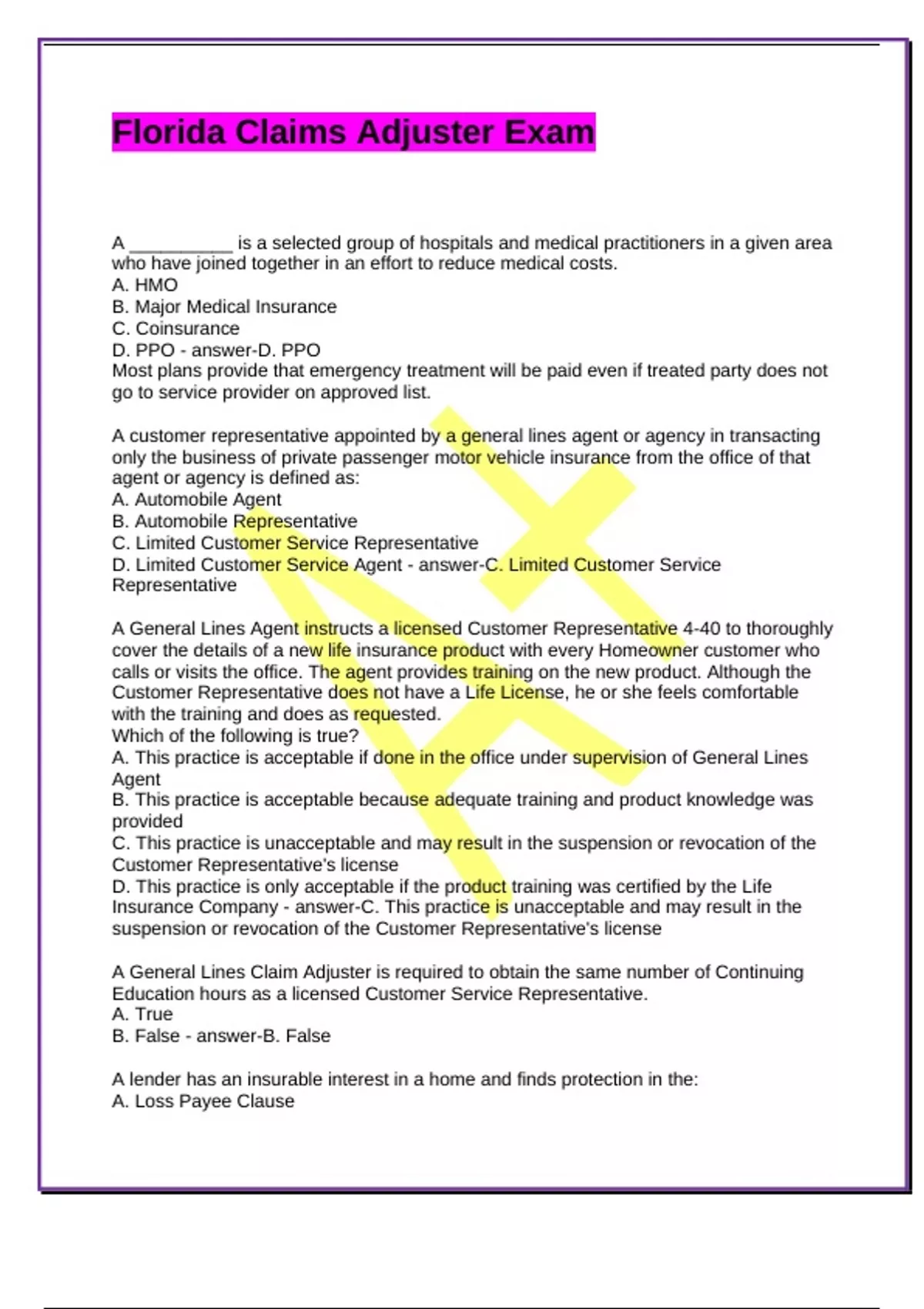 A __________ is a selected group of hospitals and medical practitioners in a given area who have joined together in an effort to reduce medical costs. A. HMO B. Major Medical Insurance C. Coinsurance D. PPO - answer-D. PPO Most plans provide that emergency treatment will be paid even if treated party does not go to service provider on approved list. A customer representative appointed by a general lines agent or agency in transacting only the business of private passenger motor vehicle insurance from the office of that agent or agency is defined as: A. Automobile Agent B. Automobile Representative C. Limited Customer Service Representative D. Limited Customer Service Agent - answer-C. Limited Customer Service Representative A General Lines Agent instructs a licensed Customer Representative 4-40 to thoroughly cover the details of a new life insurance product with every Homeowner customer who calls or visits the office. The agent provides training on the new product. Although the Customer Representative does not have a Life License, he or she feels comfortable with the training and does as requested. Which of the following is true? A. This practice is acceptable if done in the office under supervision of General Lines Agent B. This practice is acceptable because adequate training and product knowledge was provided C. This practice is unacceptable and may result in the suspension or revocation of the Customer Representative's license D. This practice is only acceptable if the product training was certified by the Life Insurance Company - answer-C. This practice is unacceptable and may result in the suspension or revocation of the Customer Representative's license A General Lines Claim Adjuster is required to obtain the same number of Continuing Education hours as a licensed Customer Service Representative. A. True B. False - answer-B. False A lender has an insurable interest in a home and finds protection in the: A. Loss Payee Clause B. Mortgagee Clause C. Lender Clause D. Additional Insured Clause - answer-B. Mortgagee Clause Mortgagee - Homeowner's policy Loss Payee - Automobile policy A licensed General Lines Claim Adjuster is required to complete how many hours of continuing education every two years? A. 6 B. 12 C. 18 D. 24 - answer-D. 24 A motor vehicle or mobile home which is a total loss is defined as: A. Lost Profit B. Salvage C. Salvageable D. All of the Above - answer-B. Salvage It cannot be restored to prior condition A policy condition, either based on information in the insured's application or inserted by the insurer, is defined as: A. Warranty B. Misrepresentation C. Concealment D. None of the Above - answer-A. Warranty A policy may contain a provision which states a period of time between issuance and acceptance before sickness benefits begin. This is defined as: A. Waiting Period B. Elimination Period C. Both A & B D. None of the Above - answer-C. Both A & B This helps keep premiums reasonable by eliminating chance of persons buying coverage only when they are sick A relationship that requires maintenance of a high degree of fidelity and loyalty to the interests of the principal, whether or not the adjuster is a direct employee is defined as: A. Fiduciary B. Estoppel C. Public D. None of the Above - answer-A. Fiduciary Should always be maintained whether or not the adjuster is a direct employee A written statement given by the insured to the insurer acknowledging that money received in the settlement of damages is received, not as a final payment, but as an advance pending an outcome of a claim against the person responsible for the damage. This is defined as a(n): A. Loan Receipt B. Subrogation Loan C. Full Release Statement D. Partial Release Statement - answer-A. Loan Receipt Enables insurer to bring an action for recovery against a third party A(n) __________ is one wherein economic loss would be suffered from an adverse happening to the subject: A. Conditional Contract B. Personal Contract C. Economic Contract D. Insurable Interest - answer-D. Insurable Interest A(n) __________ provides comprehensive health services to its members for a prepaid fixed fee, equivalent to an insurance premium. A. HMO B. PPO C. Major Medical Plan D. All of the Above - answer-A. HMO Referred to as an emerging and increasingly important non-insurance alternative to dealing with risk of health care costs Actual Cash Value - answer-Replacement cost minus depreciation After pleading guilty or no contest to a felony, a licensed individual has _________ days to inform the Department? A. 10 B. 20 C. 30 D. 40 - answer-C. 30 Alien - answer-Insurer other than domestic or foreign (outside U.S.) All of the following are components of Workers Compensation, except: A. Up to $750,000 in Death Benefits B. Reimbursement for Medical Expenses incurred C. Reimbursement for lost wages on percentage basis D. Funeral costs up to $7,500 - answer-A. Up to $750,000 in Death Benefits Compensation for death is payable if death results within one year of an accident or if it follows disability within five years of accident. All of the following are eligible for a Homeowner's Policy, except? A. An apartment tenant B. A condominium owner C. Four-family dwelling owner-occupant D. A business condo owned by a local insurance company - answer-D. A business condo owned by a local insurance company Commercial property is not eligible for a Homeowner's policy. All of the following are requirements for the "Code of Ethics," except: A. Adjusters should not give legal advice B. Adjusters may negotiate with a claimant who is represented by an attorney C. A witness who requests a copy of a statement given must be provided with one D. Adjusters will keep an unprejudiced and open mind - answer-B. Adjusters may negotiate with a claimant who is represented by an attorney Adjusters MAY NOT. Bad, adjuster, bad! An adjuster who is a salaried employee under the supervision of the home, branch, or regional claims department of insurers is de