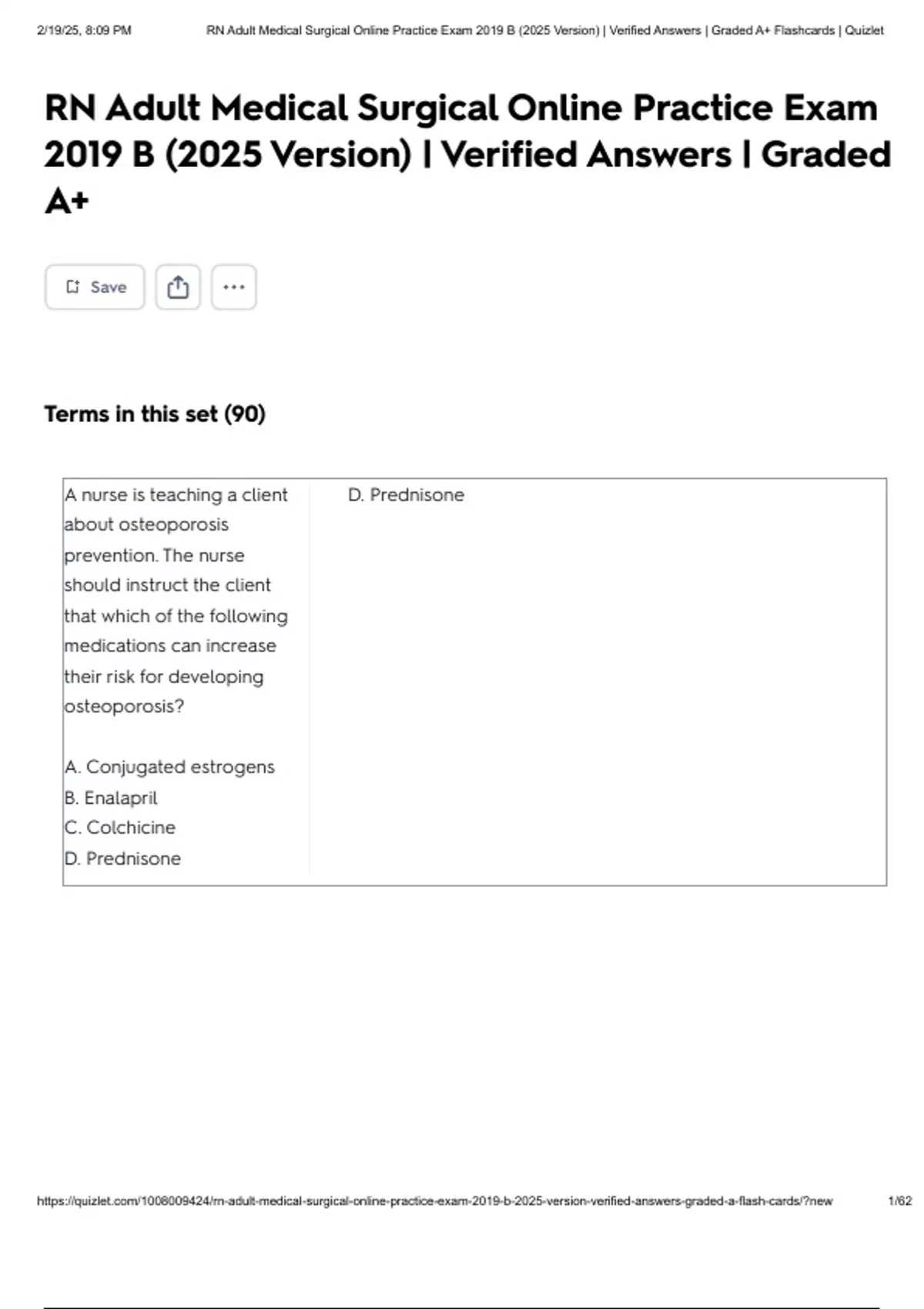 , 2/19/25, 8:09 PM RN Adult Medical Surgical Online Practice Exam 2019 B (2025 Version) | Verified Answers | Graded A+ Flashcards | Quizlet