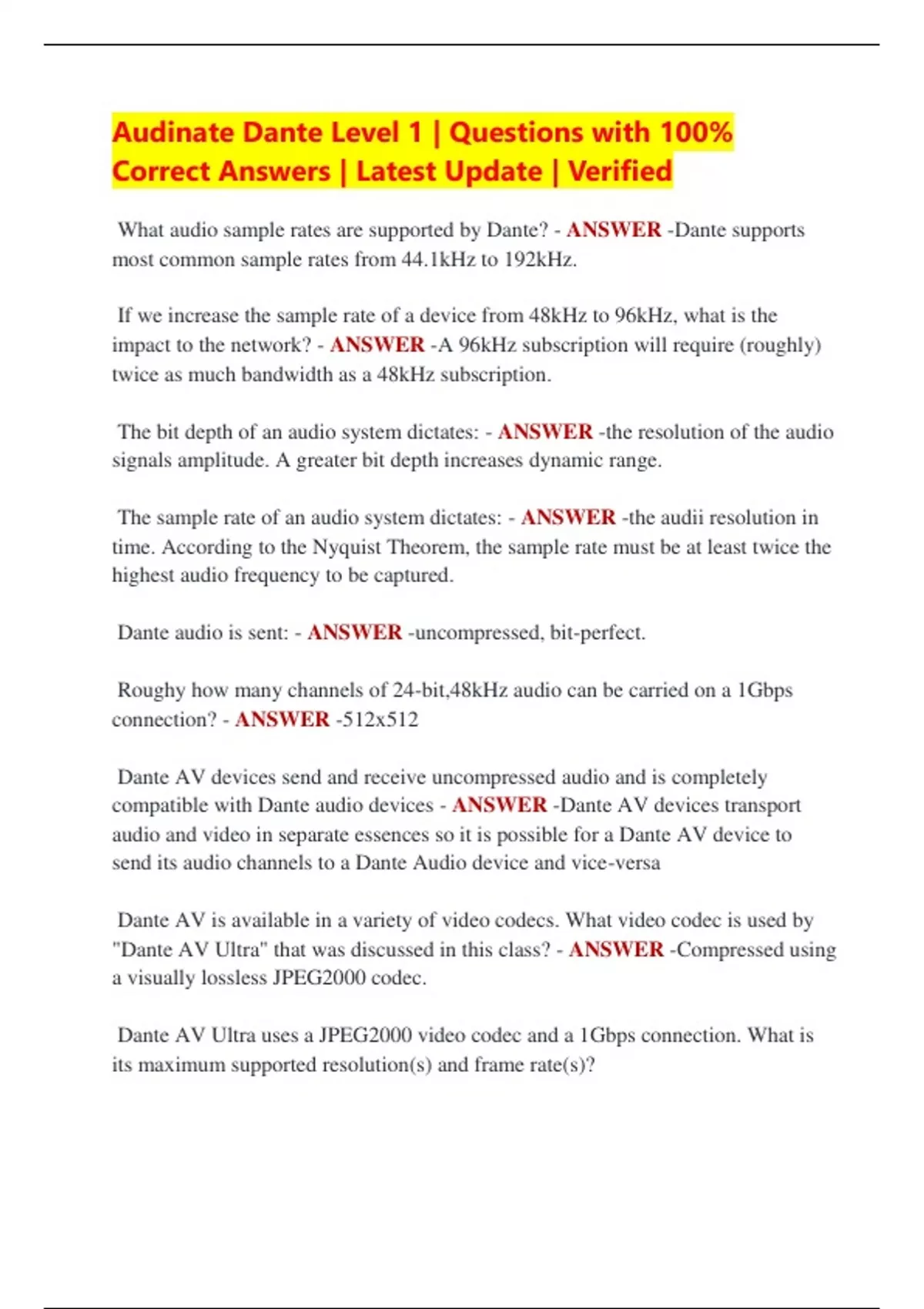 Audinate Dante Level 1 | Questions with 100% Correct Answers | Latest Update | Verified What audio sample rates are supported by Dante? - ANSWER -Dante supports most common sample rates from 44.1kHz to 192kHz. If we increase the sample rate of a device from 48kHz to 96kHz, what is the impact to the network? - ANSWER -A 96kHz subscription will require (roughly) twice as much bandwidth as a 48kHz subscription. The bit depth of an audio system dictates: - ANSWER -the resolution of the audio signals amplitude. A greater bit depth increases dynamic range. The sample rate of an audio system dictates: - ANSWER -the audii resolution in time. According to the Nyquist Theorem, the sample rate must be at least twice the highest audio frequency to be captured. Dante audio is sent: - ANSWER -uncompressed, bit-perfect. Roughy how many channels of 24-bit,48kHz audio can be carried on a 1Gbps connection? - ANSWER -512x512 Dante AV devices send and receive uncompressed audio and is completely compatible with Dante audio devices - ANSWER -Dante AV devices transport audio and video in separate essences so it is possible for a Dante AV device to send its audio channels to a Dante Audio device and vice-versa Dante AV is available in a variety of video codecs. What video codec is used by "Dante AV Ultra" that was discussed in this class? - ANSWER -Compressed using a visually lossless JPEG2000 codec. Dante AV Ultra uses a JPEG2000 video codec and a 1Gbps connection. What is its maximum supported resolution(s) and frame rate(s)? Expressions here are shown in resolution, interlaced/progressive, framerate. For example, 1080p30 means 1920x1080, progressive, 30fps. - ANSWER -Up to 4Kp60 Dante AV devices have a scaler in it. What does the scaler affect? - ANSWER - The scaler can adapt screen resolution. (i.e. - it can scale a 4K source to 1080p for display) Which ANSWER best describes the JPEG2000 encoding process? - ANSWER - There is a "visually lossless" impact on the first encoding. Further encode/decode processes will experience no further loss. Interlaced video draws all the odd lines, then all the even lines. This creates two "fields" for each frame. - ANSWER -The interlaced signal contains two fields of a video frame captured consecutively. This enhances motion perception to the viewer, and reduces flicker. JPEG2000 codecs are used in digital cinema rooms today. It is visually lossless, providing excellent results for both video and computer graphics (like spreadsheets and slide presentations). - ANSWER -The JPEG2000 offers sharp quality and intense colour definition with a visual accuracy. It is well-adopted in professional use cases. What factors significantly affect the overall bandwidth demands of a compressed video flow? (Select all that apply.) - ANSWER -The video frame resolution (i.e. - 1080p vs 4K) The chroma sampling (i.e. - 4:4:4 vs 4:2:0) The frame rate (ie 24fps vs 60fps) On a Dante network, a single clock leader is established to manage all audio sample rates and video frame rates. - ANSWER -A single Clock Leader on the network is able to keep all followers synchronised, regardless of their sample-rates or frame-rates.