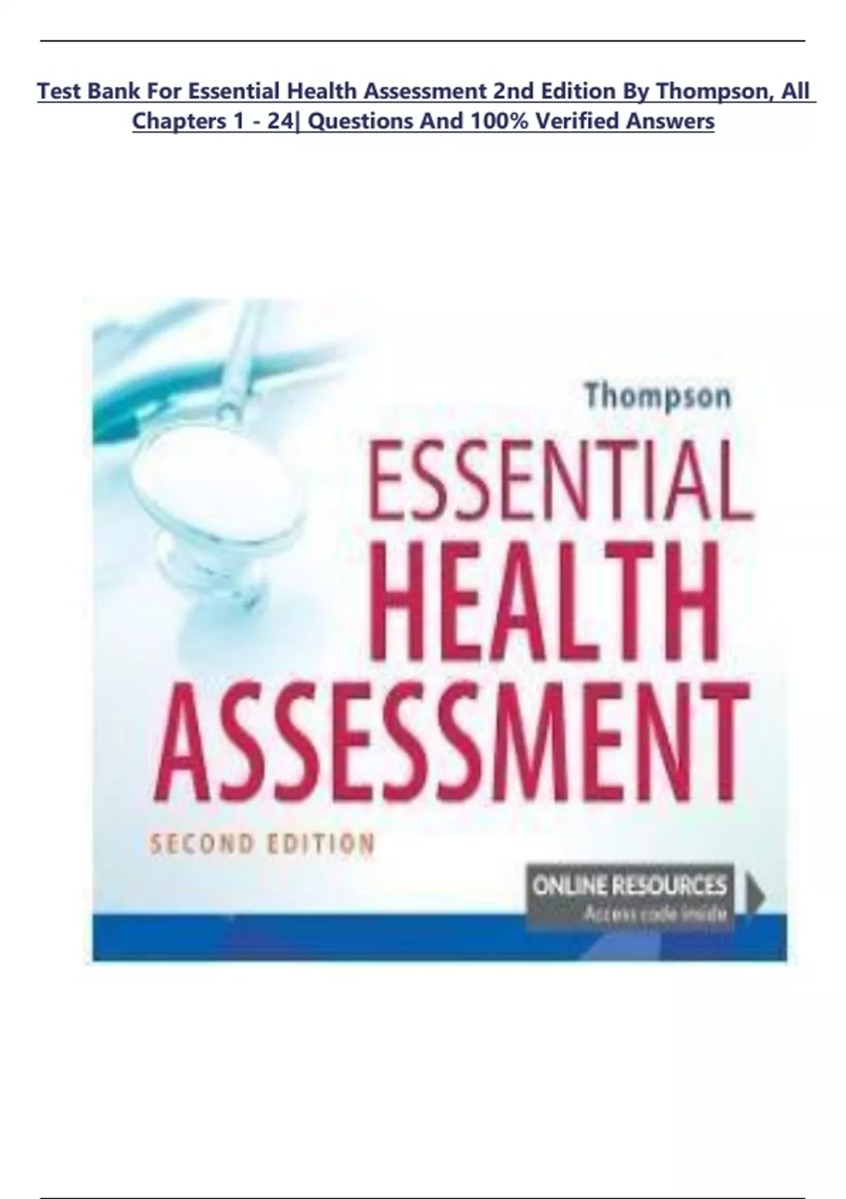 TEST BANK for Essential Health Assessment 2nd Edition by Thompson, All Chapters 1 - 24 Complete