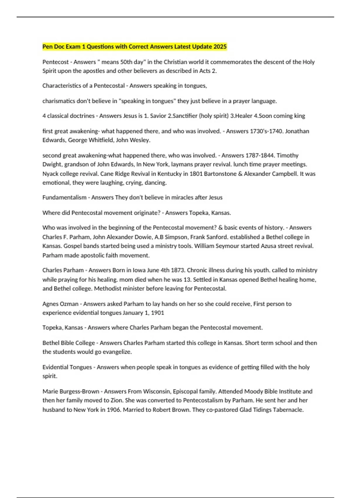 Pen Doc Exam 1 Questions with Correct Answers Latest Update 2025 Pentecost - Answers " means 50th day" in the Christian world it commemorates the descent of the Holy Spirit upon the apostles and other believers as described in Acts 2. Characteristics of a Pentecostal - Answers speaking in tongues, charismatics don't believe in "speaking in tongues" they just believe in a prayer language. 4 classical doctrines - Answers Jesus is 1. Savior 2.Sanctifier (holy spirit) 3.Healer 4.Soon coming king first great awakening- what happened there, and who was involved. - Answers 1730's-1740. Jonathan Edwards, George Whitfield, John Wesley. second great awakening-what happened there, who was involved. - Answers . Timothy Dwight, grandson of John Edwards, In New York, laymans prayer revival. lunch time prayer meetings. Nyack college revival. Cane Ridge Revival in Kentucky in 1801 Bartonstone & Alexander Campbell. It was emotional, they were laughing, crying, dancing. Fundamentalism - Answers They don't believe in miracles after Jesus Where did Pentecostal movement originate? - Answers Topeka, Kansas. Who was involved in the beginning of the Pentecostal movement? & basic events of history. - Answers Charles F. Parham, John Alexander Dowie, A.B Simpson, Frank Sanford. established a Bethel college in Kansas. Gospel bands started being used a ministry tools. William Seymour started Azusa street revival. Parham made apostolic faith movement. Charles Parham - Answers Born in Iowa June 4th 1873. Chronic illness during his youth. called to ministry while praying for his healing. mom died when he was 13. Settled in Kansas opened Bethel healing home, and Bethel college. Methodist minister before leaving for Pentecostal. Agnes Ozman - Answers asked Parham to lay hands on her so she could receive, First person to experience evidential tongues January 1, 1901 Topeka, Kansas - Answers where Charles Parham began the Pentecostal movement. Bethel Bible College - Answers Charles Parham started this college in Kansas. Short term school and then the students would go evangelize. Evidential Tongues - Answers when people speak in tongues as evidence of getting filled with the holy spirit. Marie Burgess-Brown - Answers From Wisconsin, Episcopal family. Attended Moody Bible Institute and then her family moved to Zion. She was converted to Pentecostalism by Parham. He sent her and her husband to New York in 1906. Married to Robert Brown. They co-pastored Glad Tidings Tabernacle. Galena, Kansas - Answers When Parham left Topeka he went to Galena and had a revival from October 1903-January 1904. Apostolic Faith Movement - Answers Parham started. believed in evidential tongues. Believed in salvation, sanctification, they were very loud and emotional worshippers. Houston, Texas - Answers After the revival in Galena Parham went to Houston in 1905. While there healings happened, they started a bible school where he trained the students on how to conduct street meetings and evangelistic campaigns. William Seymour - Answers African American man who started the Azusa street revival. Lucy Farrow came and was gifted in helping people receive the Holy Spirit, Frank Bartleman wrote about it. Zion City - Answers John Alexander Dowie founded it. Parham brought revival in 1906 there were 3000 conversions. John Alexander Dowie - Answers great healing evangelist. founded Zion. . founded international divine healing association. organized catholic church in Chicago which was renamed the Christian catholic apostolic church in Zion. A.B Simpson - Answers . Born in Canada to a Presbyterian family. Graduate of Knox. When he shifted from Presbyterian he believed in adult baptism, conversion experience (salvation), ordinance of women, divine healing, emphasis on foreign missions. he never spoke in tongues.