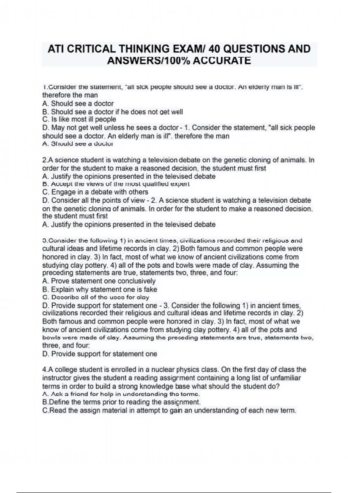 1.Consider the statement, "all sick people should see a doctor. An elderly man is ill". therefore the man A. Should see a doctor B. Should see a doctor if he does not get well C. Is like most ill people D. May not get well unless he sees a doctor - 1. Consider the statement, "all sick people should see a doctor. An elderly man is ill". therefore the man A. Should see a doctor 2.A science student is watching a television debate on the genetic cloning of animals. In order for the student to make a reasoned decision, the student must first A. Justify the opinions presented in the televised debate B. Accept the views of the most qualified expert C. Engage in a debate with others D. Consider all the points of view - 2. A science student is watching a television debate on the genetic cloning of animals. In order for the student to make a reasoned decision, the student must first A. Justify the opinions presented in the televised debate 3.Consider the following 1) in ancient times, civilizations recorded their religious and cultural ideas and lifetime records in clay. 2) Both famous and common people were honored in clay. 3) In fact, most of what we know of ancient civilizations come from studying clay pottery. 4) all of the pots and bowls were made of clay. Assuming the preceding statements are true, statements two, three, and four: A. Prove statement one conclusively B. Explain why statement one is fake C. Describe all of the uses for clay D. Provide support for statement one - 3. Consider the following 1) in ancient times, civilizations recorded their religious and cultural ideas and lifetime records in clay. 2) Both famous and common people were honored in clay. 3) In fact, most of what we know of ancient civilizations come from studying clay pottery. 4) all of the pots and bowls were made of clay. Assuming the preceding statements are true, statements two, three, and four: D. Provide support for statement one 4.A college student is enrolled in a nuclear physics class. On the first day of class the instructor gives the student a reading assignment containing a long list of unfamiliar terms in order to build a strong knowledge base what should the student do? A. Ask a friend for help in understanding the terms. B.Define the terms prior to reading the assignment. C.Read the assign material in attempt to gain an understanding of each new term. D. Wait and see if the terms makes sense in the next couple of classes - 4. A college student is enrolled in a nuclear physics class. On the first day of class the instructor gives the student a reading assignment containing a long list of unfamiliar terms in order to build a strong knowledge base what should the student do? C.Read the assign material in attempt to gain an understanding of each new term. 5.Suppose a study of heroin users shows 70% had used marijuana before they tried heroin. The conclusion of the study States all marijuana users will eventually try heroin the conclusion is A. Is a hasty generalization B. is an unclear assumption C. needs no further support D. is factual information - 5. Suppose a study of heroin users shows 70% had used marijuana before they tried heroin. The conclusion of the study States all marijuana users will eventually try heroin the conclusion is B. is an unclear assumption 6. Assume that whenever spring is late, the birds and the bees are small and hungry. Based on this assumption, which statement must be true? 1.If spring is late, either the birds are small or the bees are hungry 2.If spring is not late, the birds and the bees are neither small nor hungry 3.If the bees are not small and the birds are not hungry, spring it not late 4.If birds are hungry or the bees are small, then spring is late - 6.Assume that whenever spring is late, the birds and the bees are small and hungry. Based on this assumption, which statement must be true? 2.If spring is not late, the birds and the bees are neither small nor hungry 7. An elderly woman has cancer and is given the option of receiving an experimental drug to treat the cancer or receiving pain medication to control excessive pain. The cancer treatment might extend her life for 6 months. However, the woman chooses to use the pain medication as needed. All of the following changes support the women's choice except? 1.The woman's cancer therapy may not lengthen life 2.The woman's desire to live a better quality of life for her remaining days 3.The woman's family wants her to receive the cancer treatment 4.The woman wants to die without extraordinary medical intervention - 7. An elderly woman has cancer and is given the option of receiving an experimental drug to treat the cancer or receiving pain medication to control excessive pain. The cancer treatment might extend her life for 6 months. However, the woman chooses to use the pain medication as needed. All of the following changes support the women's choice except? 3.The woman's family wants her to receive the cancer treatment 8. The harmful effects of long term alcohol use are well documented. Which course of information best explains the harmful effects? 1.Local hospital and physician reports 2.Statistical data of the identified effects 3.Coroners reports for the last five years 4.Insurance claims from a highly populated state - 8. The harmful effects of long term alcohol use are well documented. Which course of information best explains the harmful effects? 2.Statistical data of the identified effects 9. Police officers maintain the law. It is illegal to run a stoplight, therefore, police officers 1.Never run stop lights 2.Believe it is illegal to run a stoplight 3.Consider stoplights important 4.May issue a ticket if you run a stoplight - 9. Police officers maintain the law. It is illegal to run a stoplight, therefore, police officers 2.Believe it is illegal to run a stoplight 10. A woman reads a magazine article about high blood pressure. After talking with her mother, the woman realizes that her mother is experiencing