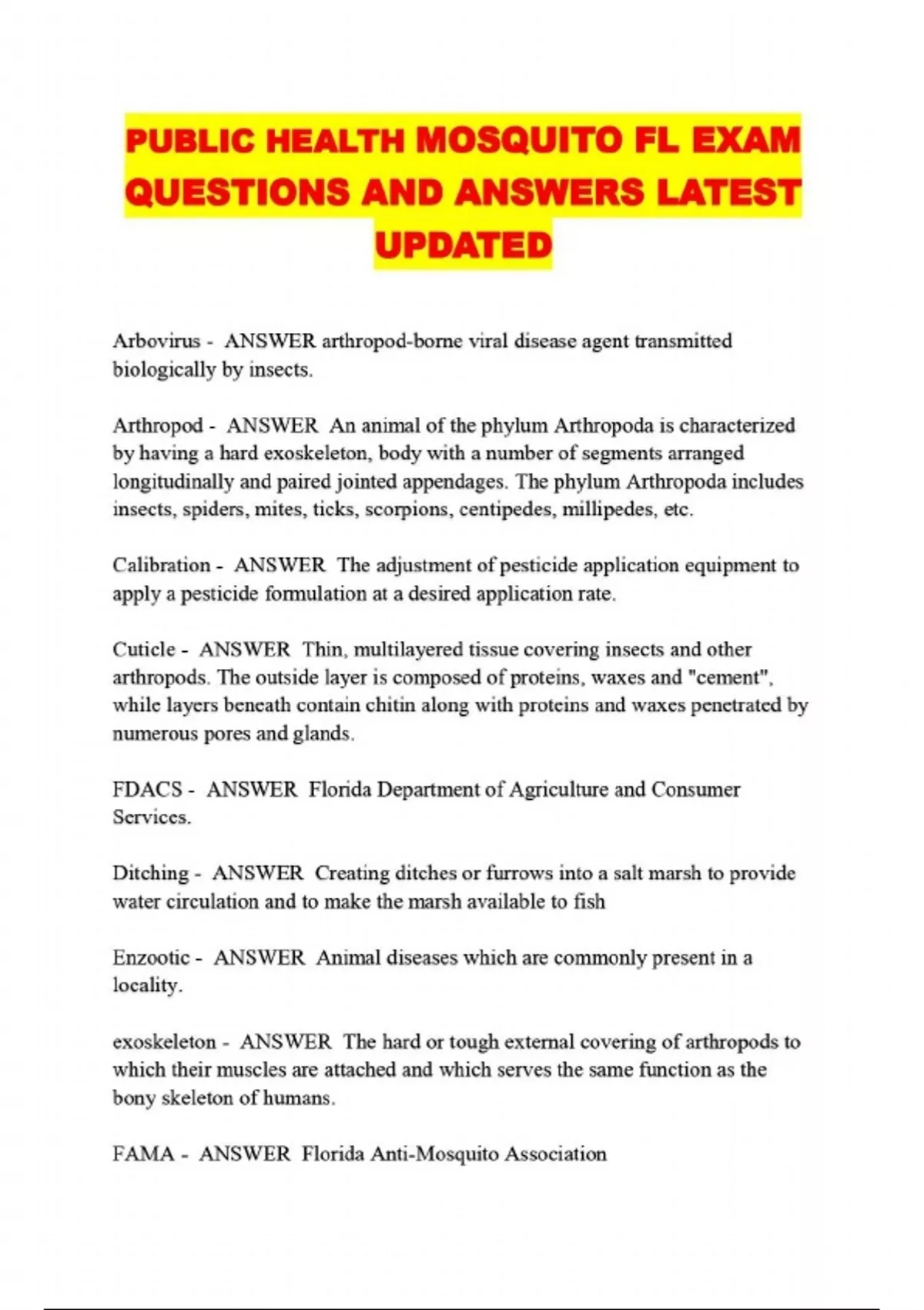 PUBLIC HEALTH MOSQUITO FL EXAM QUESTIONS AND ANSWERS LATEST UPDATED