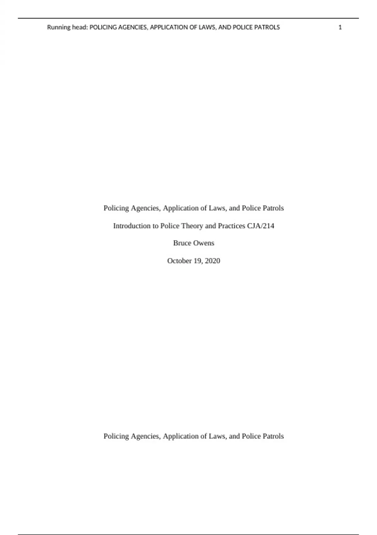 , Running head: POLICING AGENCIES, APPLICATION OF LAWS, AND POLICE PATROLS 2