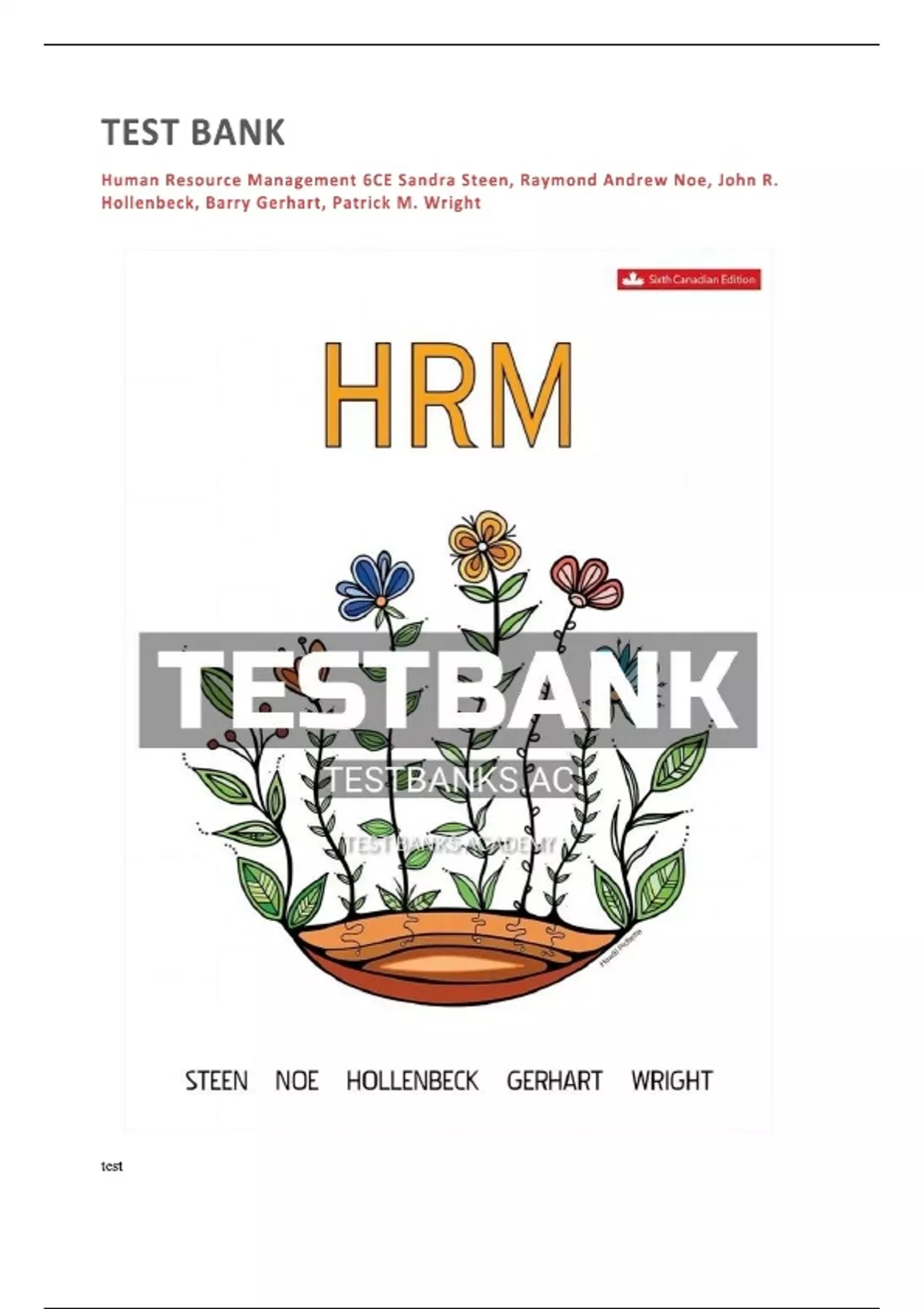 TEST BANK FOR Human Resource Management 6CE Sandra Steen, Raymond Andrew Noe, John R.