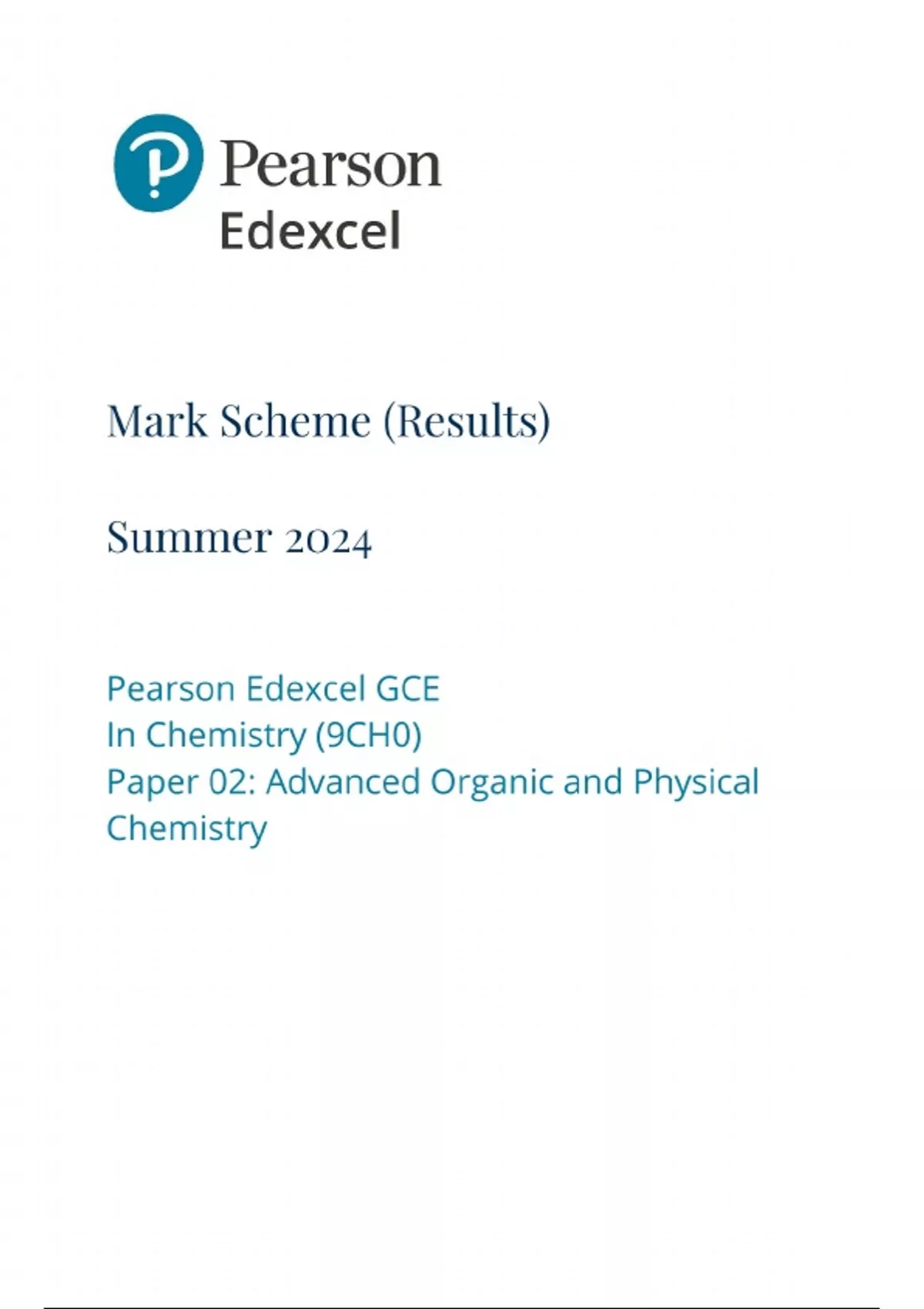 PEARSON Edexcel A LEVEL GCE Chemistry Advanced Mark Scheme Paper 2 2024:Advanced Organic and Physical Chemistry(9CH0/02)