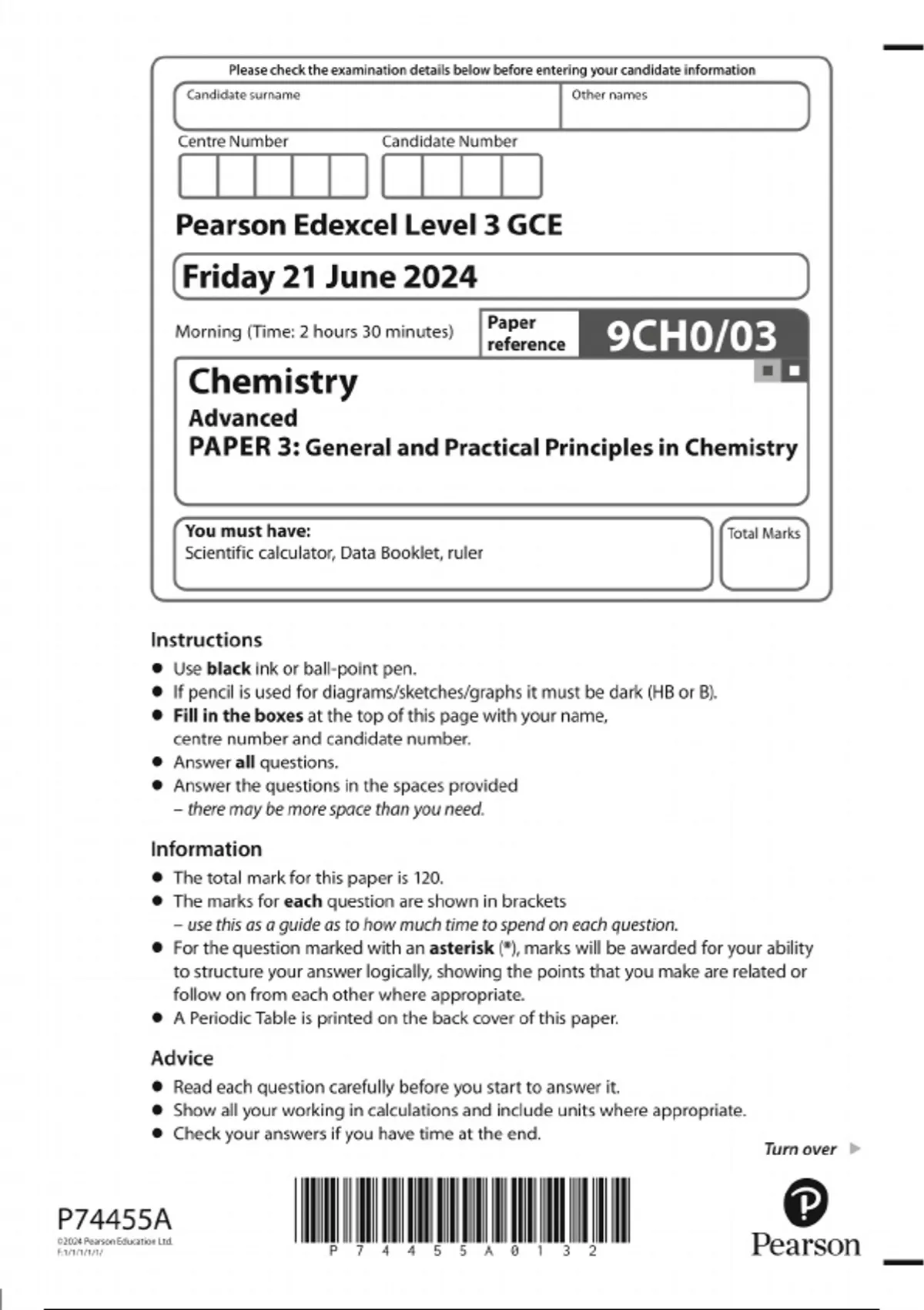 PEARSON Edexcel A LEVEL GCE Chemistry Advanced Question Paper 3 2024:General and Practical Principles in Chemistry (9CH0/03)