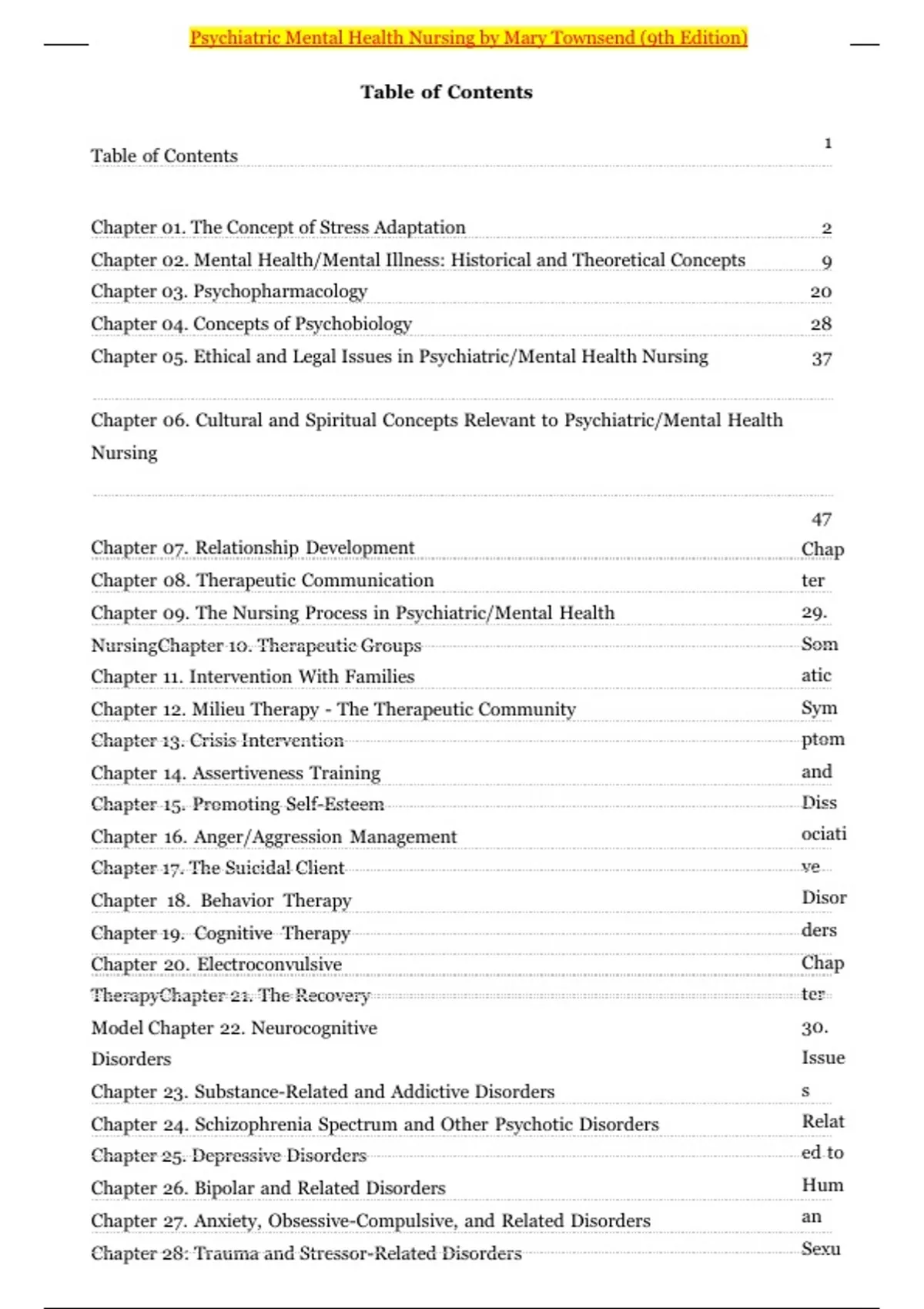 Table of Contents Chapter 01. The Concept of Stress Adaptation 2 Chapter 02. Mental Health/Mental Illness: Historical and Theoretical Concepts 9 Chapter 03. Psychopharmacology 20 Chapter 04. Concepts of Psychobiology 28 Chapter 05. Ethical and Legal Issues in Psychiatric/Mental Health Nursing 37 Chapter 06. Cultural and Spiritual Concepts Relevant to Psychiatric/Mental Health Nursing 47 Chapter 07. Relationship Development Chap ter 29. Som atic Sym ptom and Diss ociati ve Disor ders Chapter 08. Therapeutic Communication Chapter 09. The Nursing Process in Psychiatric/Mental Health NursingChapter 10. Therapeutic Groups Chapter 11. Intervention With Families Chapter 12. Milieu Therapy - The Therapeutic Community Chapter 13. Crisis Intervention Chapter 14. Assertiveness Training Chapter 15. Promoting Self-Esteem Chapter 16. Anger/Aggression Management Chapter 17. The Suicidal Client Chapter 18. Behavior Therapy Chapter 19. Cognitive Therapy Chapter 20. Electroconvulsive TherapyChapter 21. The Recovery Model Chapter 22. Neurocognitive Disorders Chap ter 30. Issue s Relat ed to Hum an Sexu Chapter 23. Substance-Related and Addictive Disorders Chapter 24. Schizophrenia Spectrum and Other Psychotic Disorders Chapter 25. Depressive Disorders Chapter 26. Bipolar and Related Disorders Chapter 27. Anxiety, Obsessive-Compulsive, and Related Disorders Chapter 28: Trauma and Stressor-Related Disorders 2 Psychiatric Mental Health Nursing by Mary Townsend (9th Edition) ality and Gender DysphoriaChapter 31. Eating Disorders 54 Chapter 32. Personality Disorders Chapter 33. Children and AdolescentsChapter 34. The Aging Individual 62 74 85 93 Chapter 35. Survivors of Abuse or Neglect Chapter 36. Community Mental Health NursingChapter 37. The Bereaved Individual 99 104 109 Chapter 38. Military Families