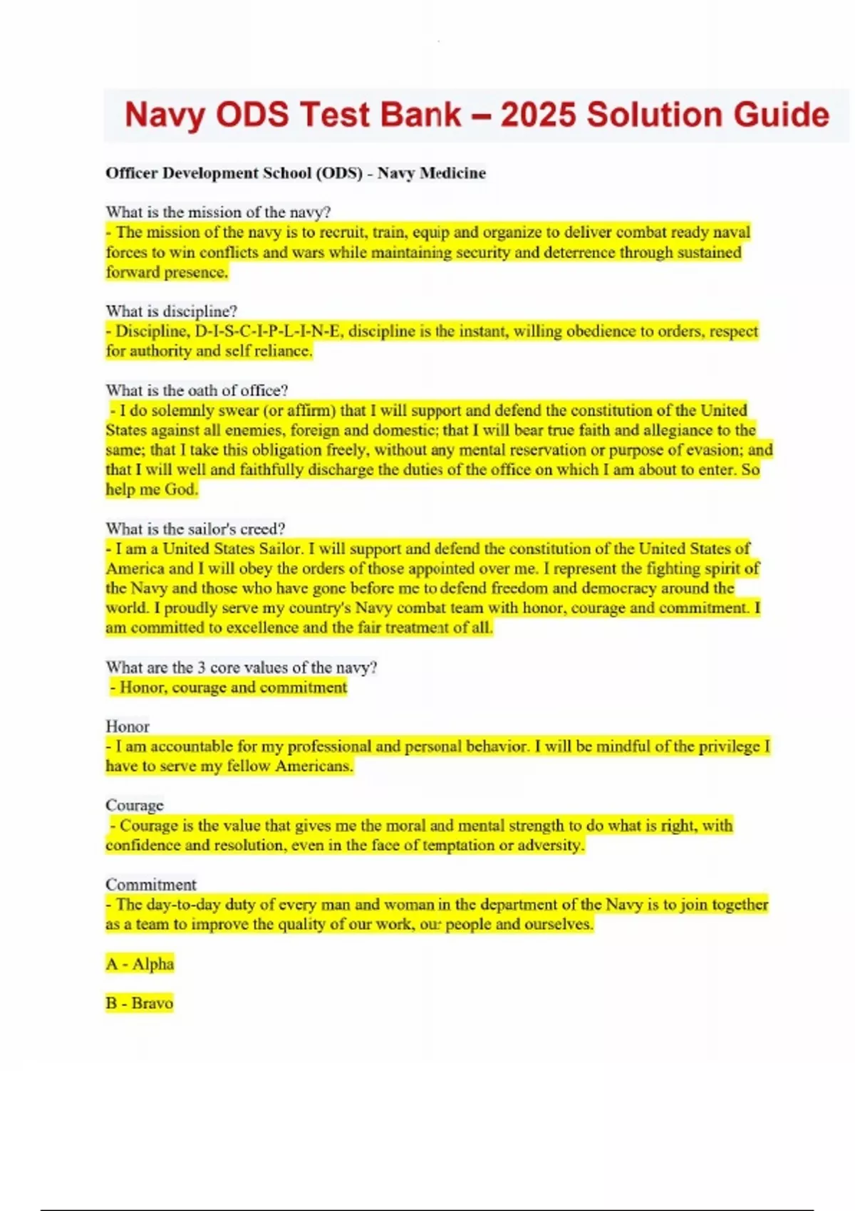 Prepare for success with the Navy Officer Development School (ODS) Test Bank Solution Guide 2025. This comprehensive resource provides accurate answers and explanations to help you master key concepts covered in the ODS exam. Covering essential topics such as military structure, leadership principles, naval regulations, and operational readiness, this guide is designed to support officers in training. Ideal for those seeking a structured and reliable study aid for exam preparation.