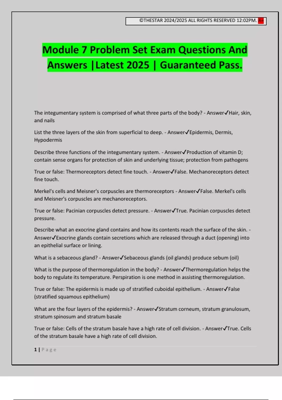 ©THESTAR 2024/2025 ALL RIGHTS RESERVED 12:02PM. A+ 1 | P a g e Module 7 Problem Set Exam Questions And Answers |Latest 2025 | Guaranteed Pass. The integumentary system is comprised of what three parts of the body? - AnswerHair, skin, and nails List the three layers of the skin from superficial to deep. - AnswerEpidermis, Dermis, Hypodermis Describe three functions of the integumentary system. - AnswerProduction of vitamin D; contain sense organs for protection of skin and underlying tissue; protection from pathogens True or false: Thermoreceptors detect fine touch. - AnswerFalse. Mechanoreceptors detect fine touch. Merkel's cells and Meisner's corpuscles are thermoreceptors - AnswerFalse. Merkel's cells and Meisner's corpuscles are mechanoreceptors. True or false: Pacinian corpuscles detect pressure. - AnswerTrue. Pacinian corpuscles detect pressure. Describe what an exocrine gland contains and how its contents reach the surface of the skin. - AnswerExocrine glands contain secretions which are released through a duct (opening) into an epithelial surface or lining. What is a sebaceous gland? - AnswerSebaceous glands (oil glands) produce sebum (oil) What is the purpose of thermoregulation in the body? - AnswerThermoregulation helps the body to regulate its temperature. Perspiration is one method in assisting thermoregulation. True or false: The epidermis is made up of stratified cuboidal epithelium. - AnswerFalse (stratified squamous epithelium) What are the four layers of the epidermis? - AnswerStratum corneum, stratum granulosum, stratum spinosum and stratum basale True or false: Cells of the stratum basale have a high rate of cell division. - AnswerTrue. Cells of the stratum basale have a high rate