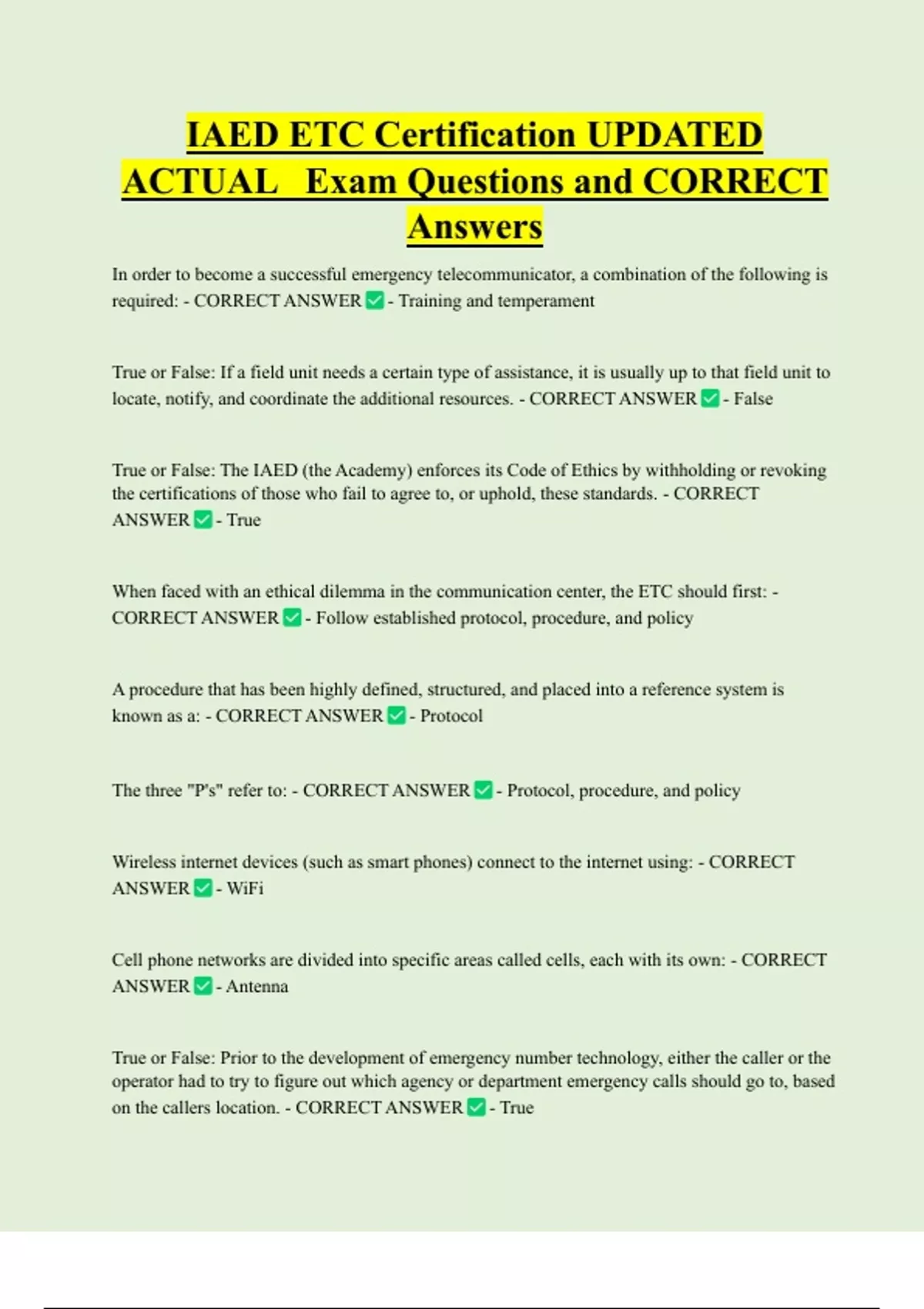 IAED ETC Certification UPDATED ACTUAL Exam Questions and CORRECT Answers In order to become a successful emergency telecommunicator, a combination of the following is required: - CORRECT ANSWER - Training and temperament True or False: If a field unit needs a certain type of assistance, it is usually up to that field unit to locate, notify, and coordinate the additional resources. - CORRECT ANSWER - Fals