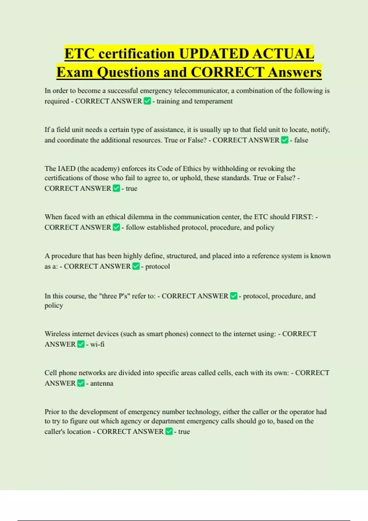 ETC certification UPDATED ACTUAL Exam Questions and CORRECT Answers In order to become a successful emergency telecommunicator, a combination of the following is required - CORRECT ANSWER - training and temperament If a field unit needs a certain type of assistance, it is usually up to that field unit to locate, notify, and coordinate the additional resources. True or False? - CORRECT ANSWER - false