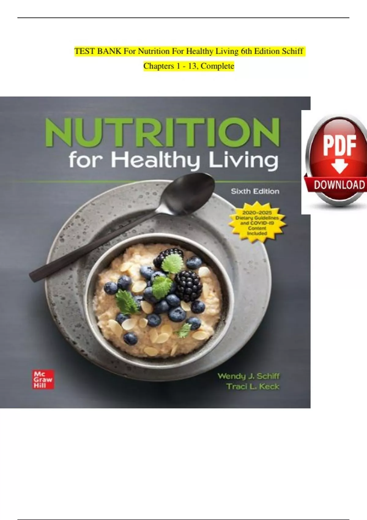 ​The Test Bank for Nutrition for Healthy Living, 6th Edition by Wendy Schiff (Chapters 1–13) is a comprehensive resource designed to aid students in mastering key concepts in nutrition. This test bank includes a variety of question formats, such as multiple-choice, true/false, and short-answer questions, covering all 13 chapters of the textbook. Topics encompass the basics of nutrition, evaluating nutrition information, planning nutritious diets, body basics, carbohydrates, fats and lipids, proteins, vitamins, water and minerals, energy balance and weight control, nutrition for physically active lifestyles, food safety concerns, and nutrition for a lifetime. Each question is accompanied by detailed rationales, facilitating a deeper understanding of the material. This resource is ideal for exam preparation, reinforcing essential knowledge in nutrition science.