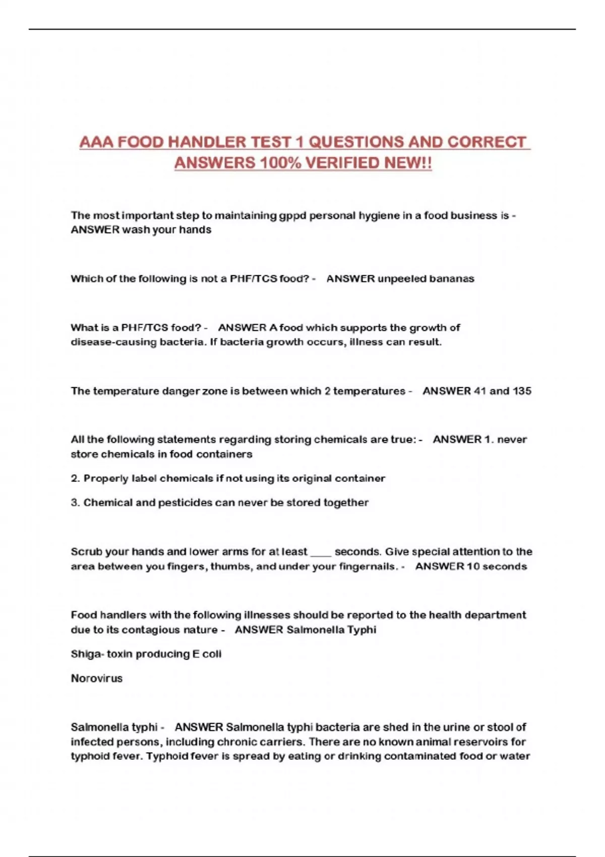 AAA FOOD HANDLER TEST 1 QUESTIONS AND CORRECT ANSWERS 100% VERIFIED NEW!!...