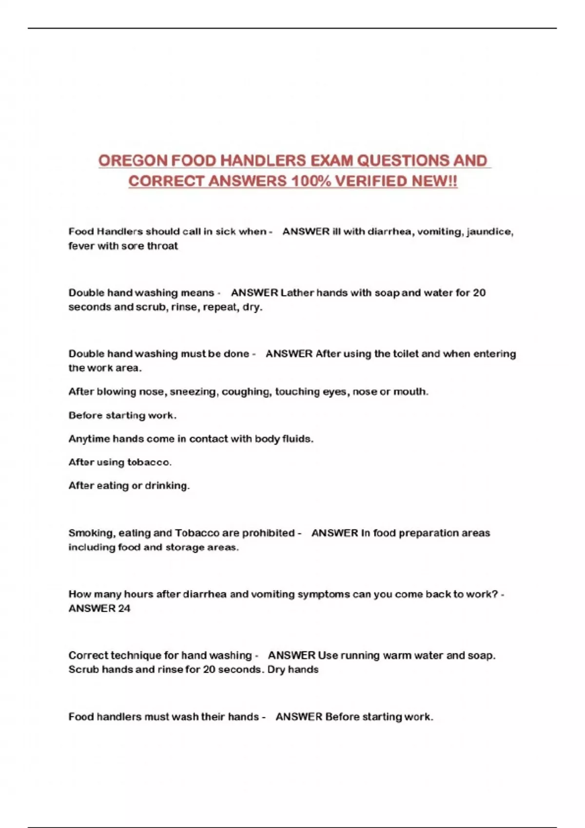 OREGON FOOD HANDLERS EXAM QUESTIONS AND CORRECT ANSWERS 100% VERIFIED NEW!!...