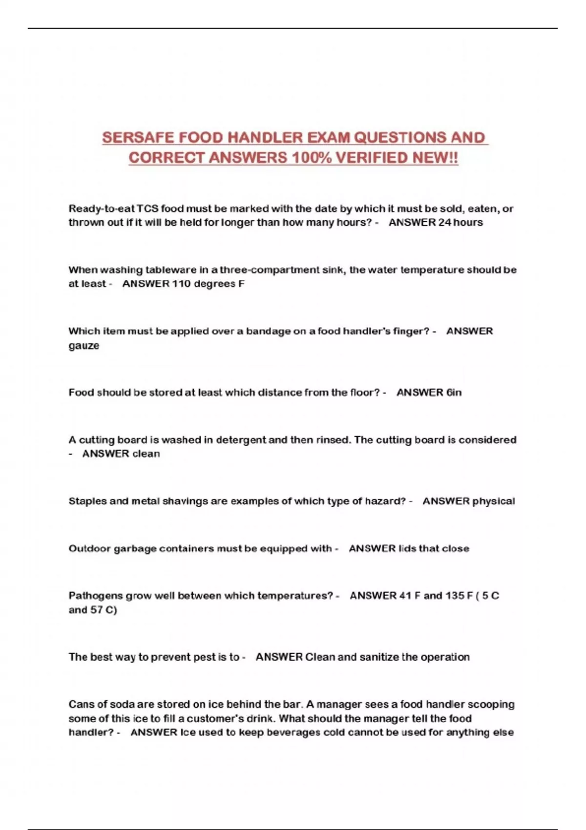 SERSAFE FOOD HANDLER EXAM QUESTIONS AND CORRECT ANSWERS 100% VERIFIED NEW!!...