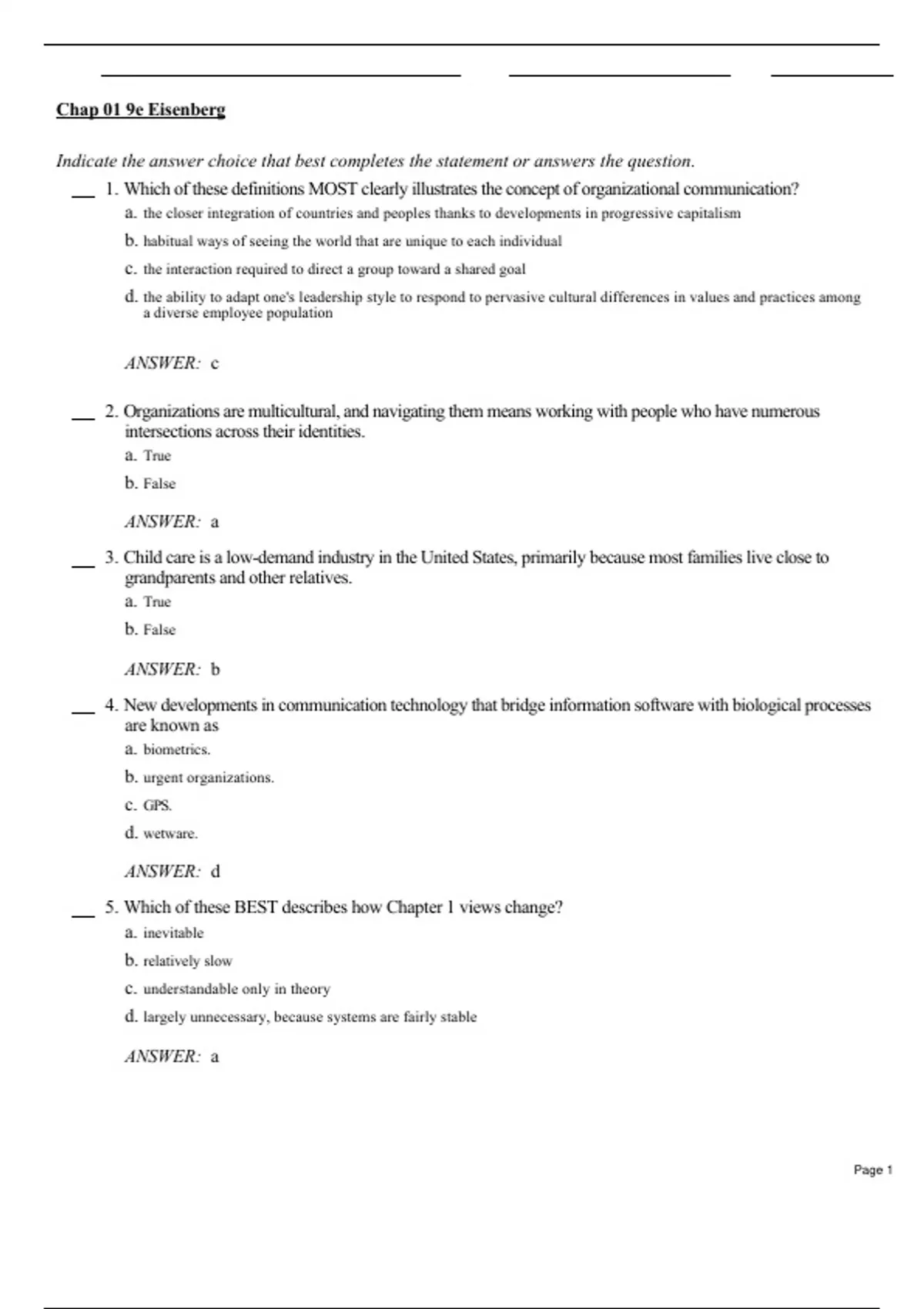 Test Bank for Organizational Communication: Balancing Creativity and Constraint, 9e 9th Edition by Eric M. Eisenberg, Angela Trethewey; Marianne LeGreco; H. L. Goodall Jr. Complete Chapters (Chap 1 to 10) test bank are included with answers. Part I Approaching Organizational Communication Chapter 1 Communication and the Changing World of Work Chapter 2 Defining Organizational Communication Part II Theories of Organizational Communication Chapter 3 Early Perspectives on Communication in Organizations Chapter 4 Communication Perspectives on Organizations and Organizing Chapter 5 Cultural Studies of Organizations and Communication Chapter 6 Critical Approaches to Organizations and Communication Part III Contexts for Organizational Communication Chapter 7 Identity and Difference in Organizational Life Chapter 8 Teams and Networks: Communication and Collaborative Work Chapter 9 Communicating Leadership Chapter 10 Organizational Alignment: Managing the Total Enterprise