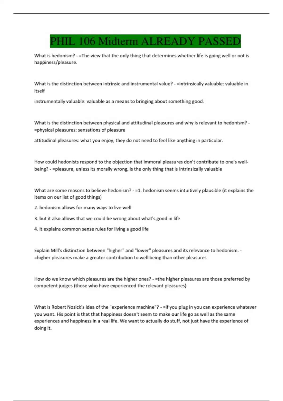 being? - =pleasure, unless its morally wrong, is the only thing that is intrinsically valuable