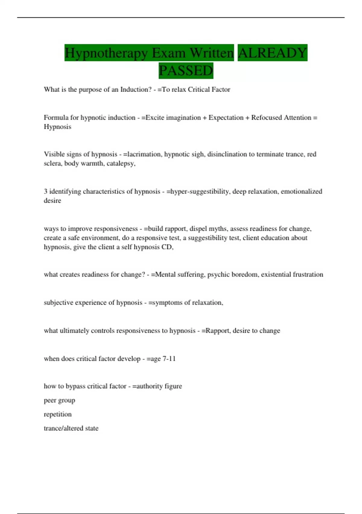 Hypnotherapy Exam Written ALREADY PASSED