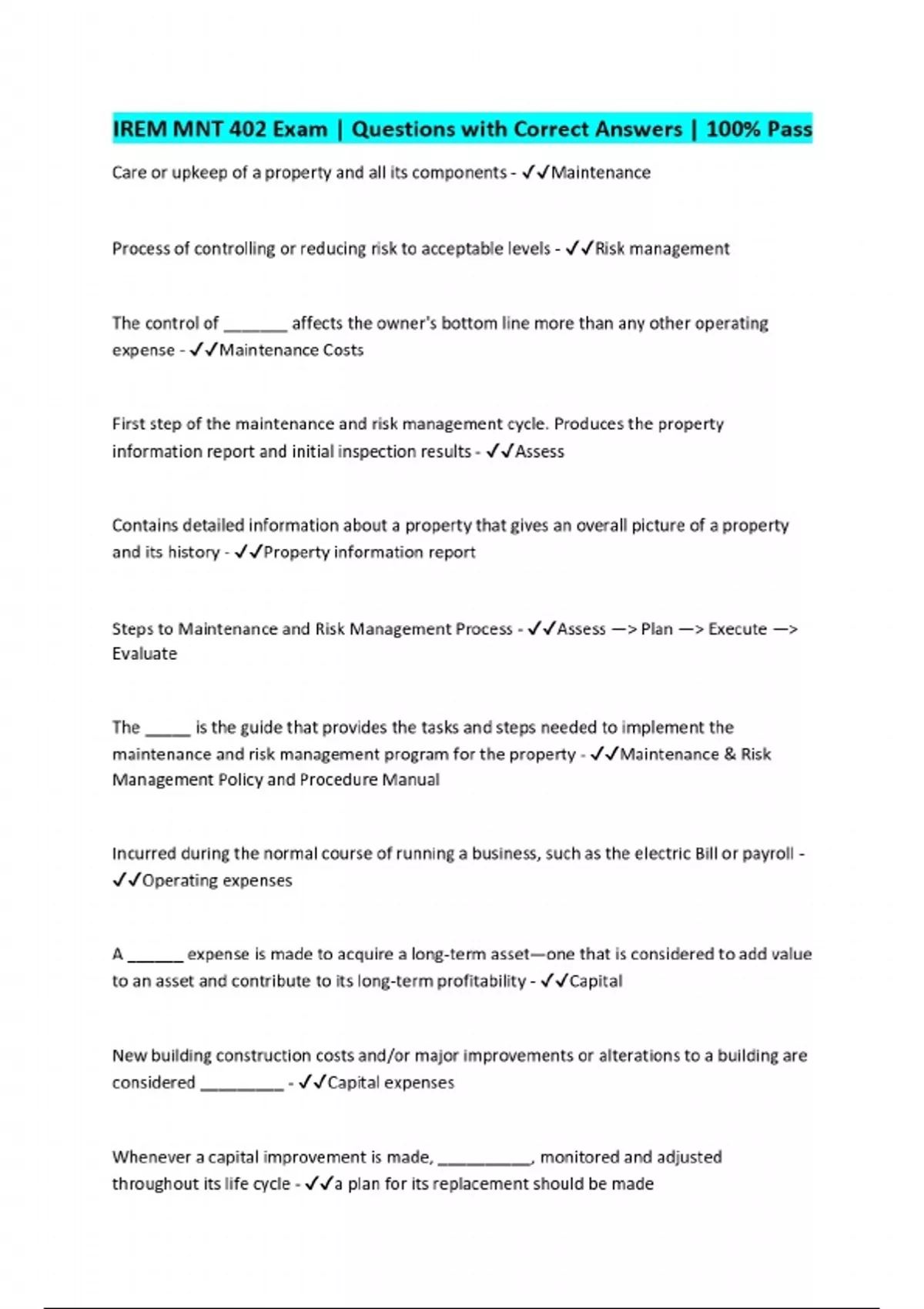 IREM MNT 402 Exam | Questions with Correct Answers | 100% Pass