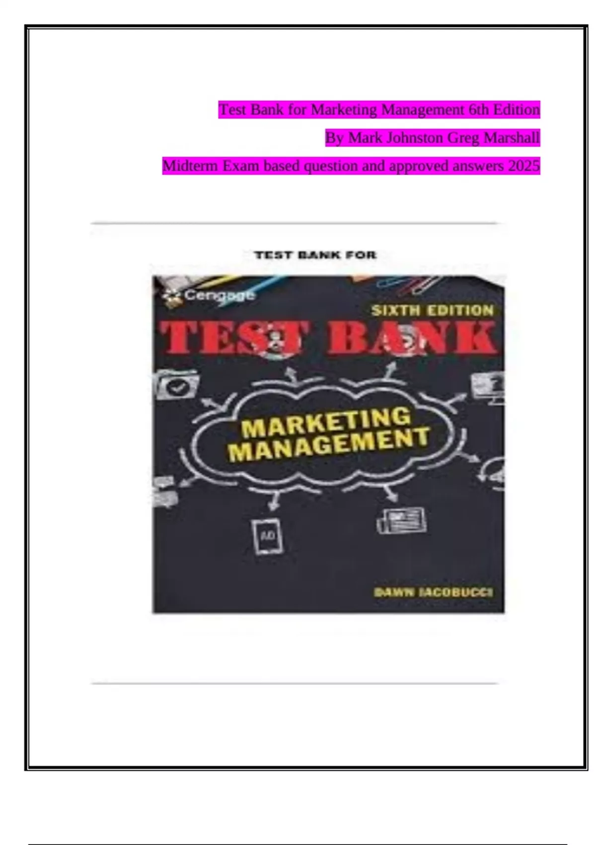 Test Bank for Marketing Management 4th Edition By Mark Johnston Greg Marshall Midterm Exam based question and approved answers 2025 Consumers who have interest, income, and access to a particular offer. (Answer)- Available market Part of the qualified available market the company decides to pursue (Answer)- Target Market Set of consumers who are buying the company's product (Answer)- Penetrated Market Total volume that would be bought by a defined customer group in a defined geographical area in a defined time period in a defined marketing environment under a defined marketing program (Answer)- Market Demand Maximum sales available to all firms in an industry during a given period, under a given level of industry marketing effort and environmental conditions. Multiply the potential number of buyers by the average quantity purchases and then by the price (Answer)- Total Market potential Calls for identifying all the potential buyers in each market and estimating their potential purchases. Accurate if there is a list of all potential buyers and a good estimate of what each will buy (Answer)- Market build-up method Straightforward index for estimating market potentials. (Weighted average) (Answer)- Market-Factor Index Method Your company's percentage of an industry or market's total sales over a specified time period. Validates your position in the market and helps you fine-tune your overall marketing plan. (Answer)- Market Share Part of anticipating what buys likely to do under a given set of conditions (Answer)- Forecasting When interviewing buyers is impractical, the company may ask its sales representatives to estimate their future sales. (Answer)- Composite of sales force opinions Obtain forecasts from experts, including dealers, distributors, suppliers, marketing consultants, and trade associations (Answer)- Expert Opinion The function that links the consumer, customer, and public to the marketer through information. Information used to identify and define marketing opportunities and problems; generate, refine, and evaluate marketing actions monitor marketing performance and improve understanding of marketing as a process (Answer)- Marketing Research Provide diagnostic information about how and why we observe certain effects in the marketplace and what that means to marketers (Answer)- Marketing insights These firms gather consumer and trade information, which they sell for a fee (Answer)- Syndicated-service research firms Hired to carry our specific projects. They design the study and report the findings (Answer)- Customer marketing research firms Provide specialized research services. Best example is the field-service firm, which sells field interviewing services to other firms (Answer)- Specialty Line Marketing Research firms Exploring options (to shed light on the real nature of the problem and to suggest possible solutions or new ideas) (Research Objectives) (Answer)- Exploratory Ex: How many people would use the internet for $5 (Research Objectives) (Answer)- Descriptive Ex: Would passengers use the internet more if they could use their own devices? Cause and effect (Research Objectives) (Answer)- Causal Observing unobtrusively as customers shop or consumer products (Research Approaches) (Answer)- Observational Research Uses concepts and tools from anthropology and other social science disciplines to provide deep cultural understanding of how people live and work. Goal is to immerse the researcher into consumers' lives to uncover unarticulated desires that might not surface in any other form of research (Research Approaches) (Answer)- Ethnographic Research Gathering 6-10 people who spend a few hours with a skilled moderator to discuss a product, service, or other marketing entity (Research Approaches) (Answer)- Focus Group