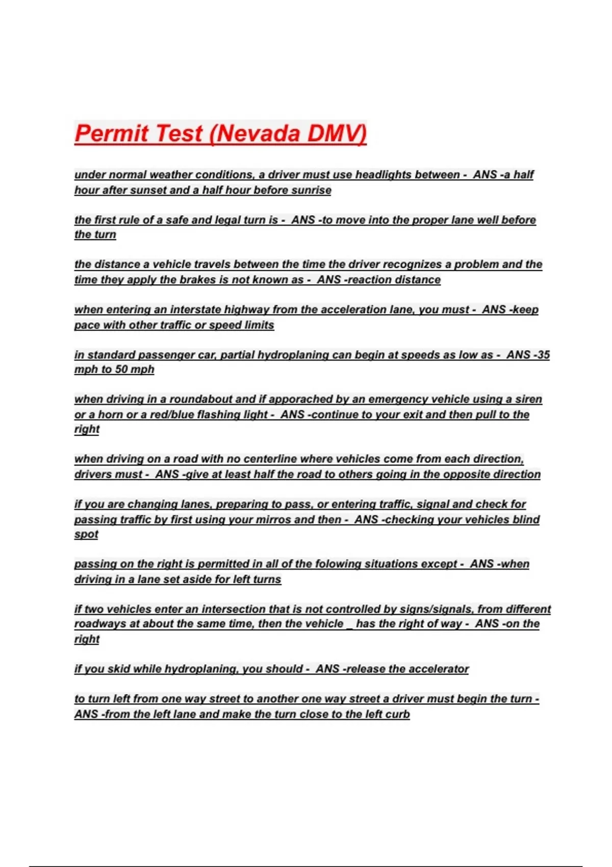 Permit Test (Nevada DMV) Questions and Answers 2025/2026( A+ GRADED 100% VERIFIED).