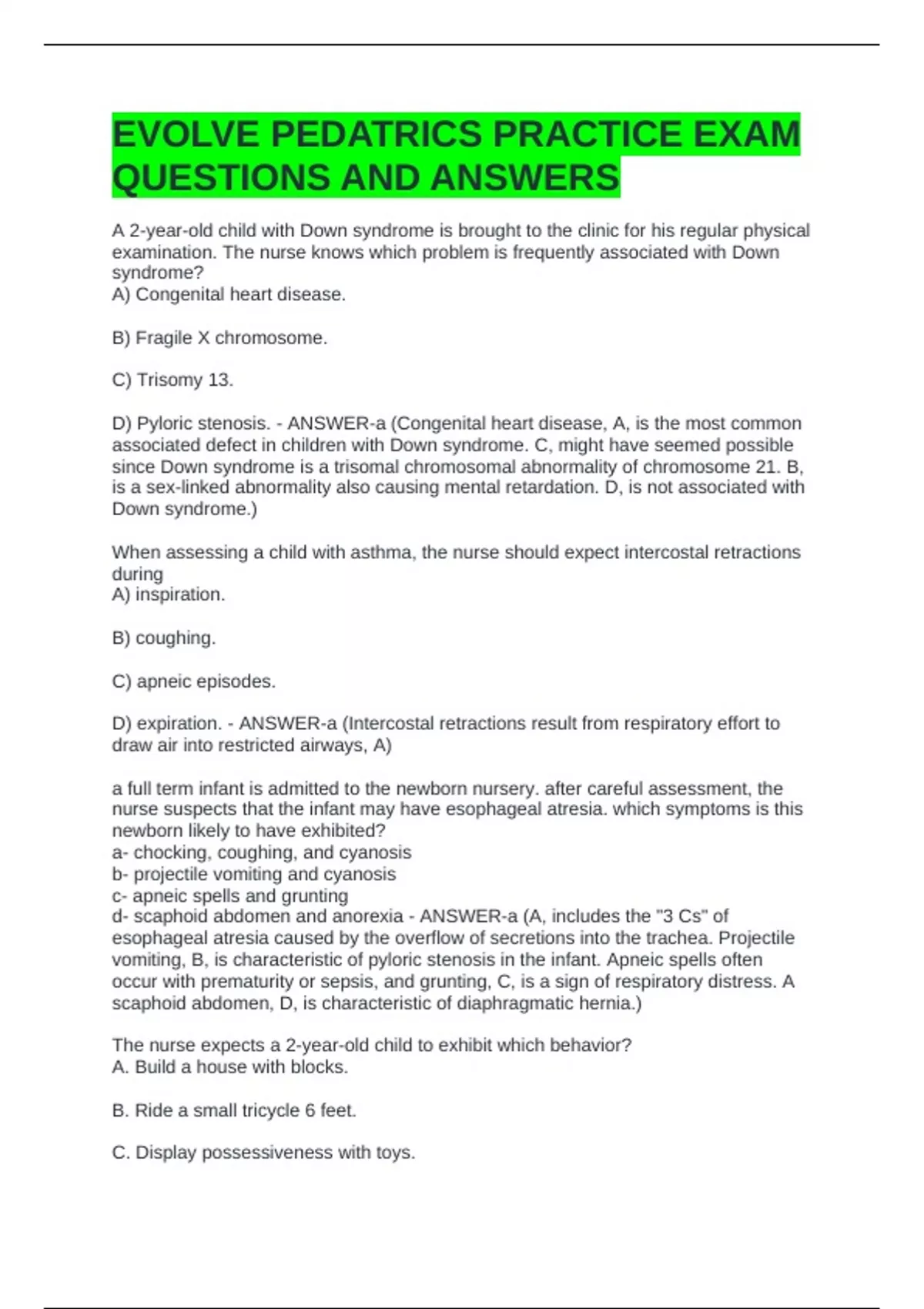 EVOLVE PEDATRICS PRACTICE EXAM QUESTIONS AND ANSWERS