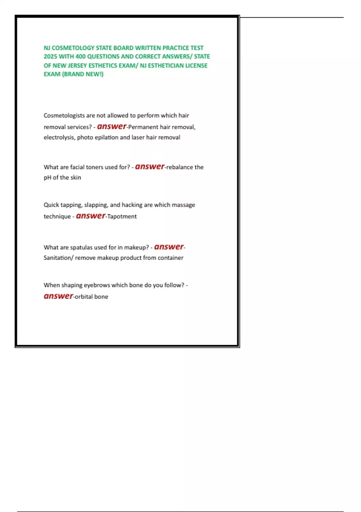 NJ COSMETOLOGY STATE BOARD WRITTEN PRACTICE TEST 2025 WITH 400 QUESTIONS AND CORRECT ANSWERS/ STATE OF NEW JERSEY ESTHETICS EXAM/ NJ ESTHETICIAN LICENSE EXAM (BRAND NEW!)