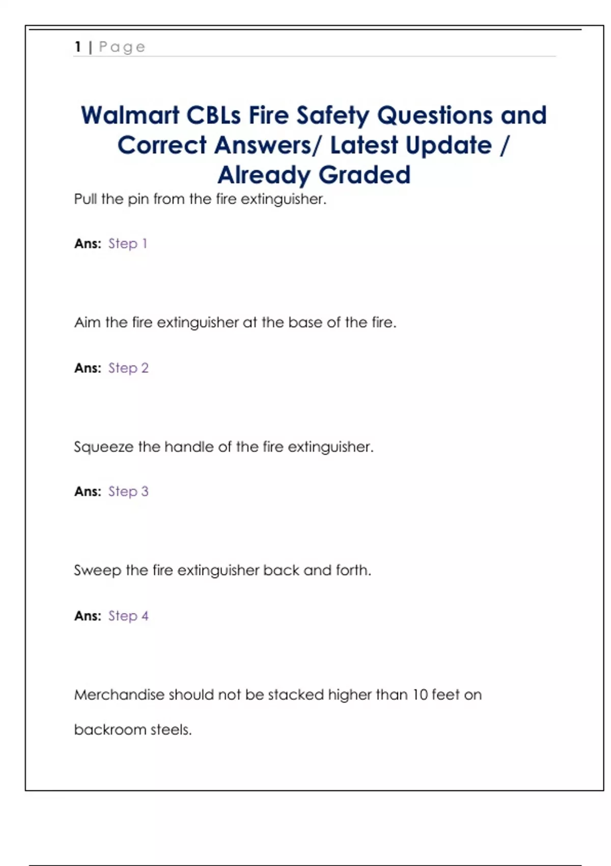 Pull the pin from the fire extinguisher. Ans: Step 1 Aim the fire extinguisher at the base of the fire. Ans: Step 2 Squeeze the handle of the fire extinguisher. Ans: Step 3 Sweep the fire extinguisher back and forth. Ans: Step 4 Merchandise should not be stacked higher than 10 feet on backroom steels.