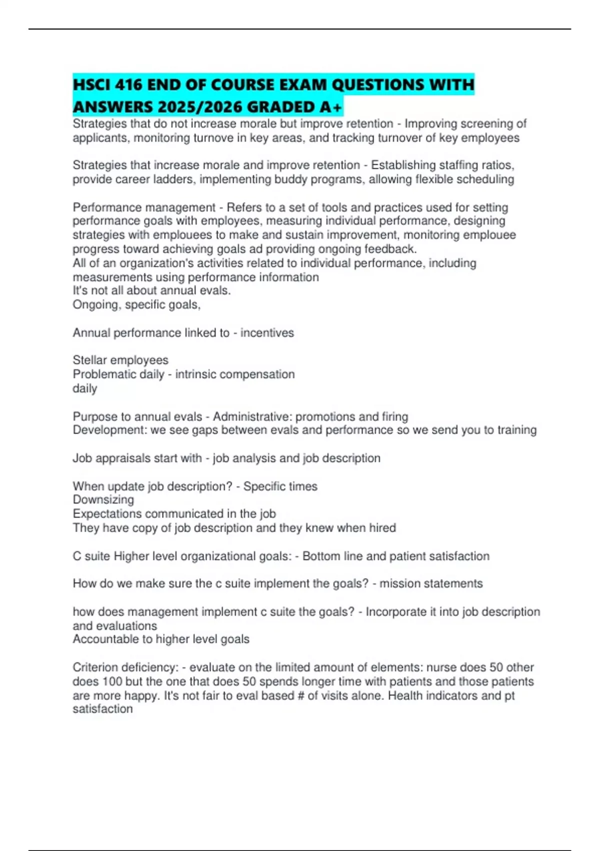 HSCI 416 END OF COURSE EXAM QUESTIONS WITH ANSWERS 2025/2026 GRADED A+ Strategies that do not increase morale but improve retention - Improving screening of applicants, monitoring turnove in key areas, and tracking turnover of key employees Strategies that increase morale and improve retention - Establishing staffing ratios, provide career ladders, implementing buddy programs, allowing flexible scheduling Performance management - Refers to a set of tools and practices used for setting performance goals with employees, measuring individual performance, designing strategies with emplouees to make and sustain improvement, monitoring emplouee progress toward achieving goals ad providing ongoing feedback. All of an organization's activities related to individual performance, including measurements using performance information It's not all about annual evals. Ongoing, specific goals, Annual performance linked to - incentives Stellar employees Problematic daily - intrinsic compensation daily
